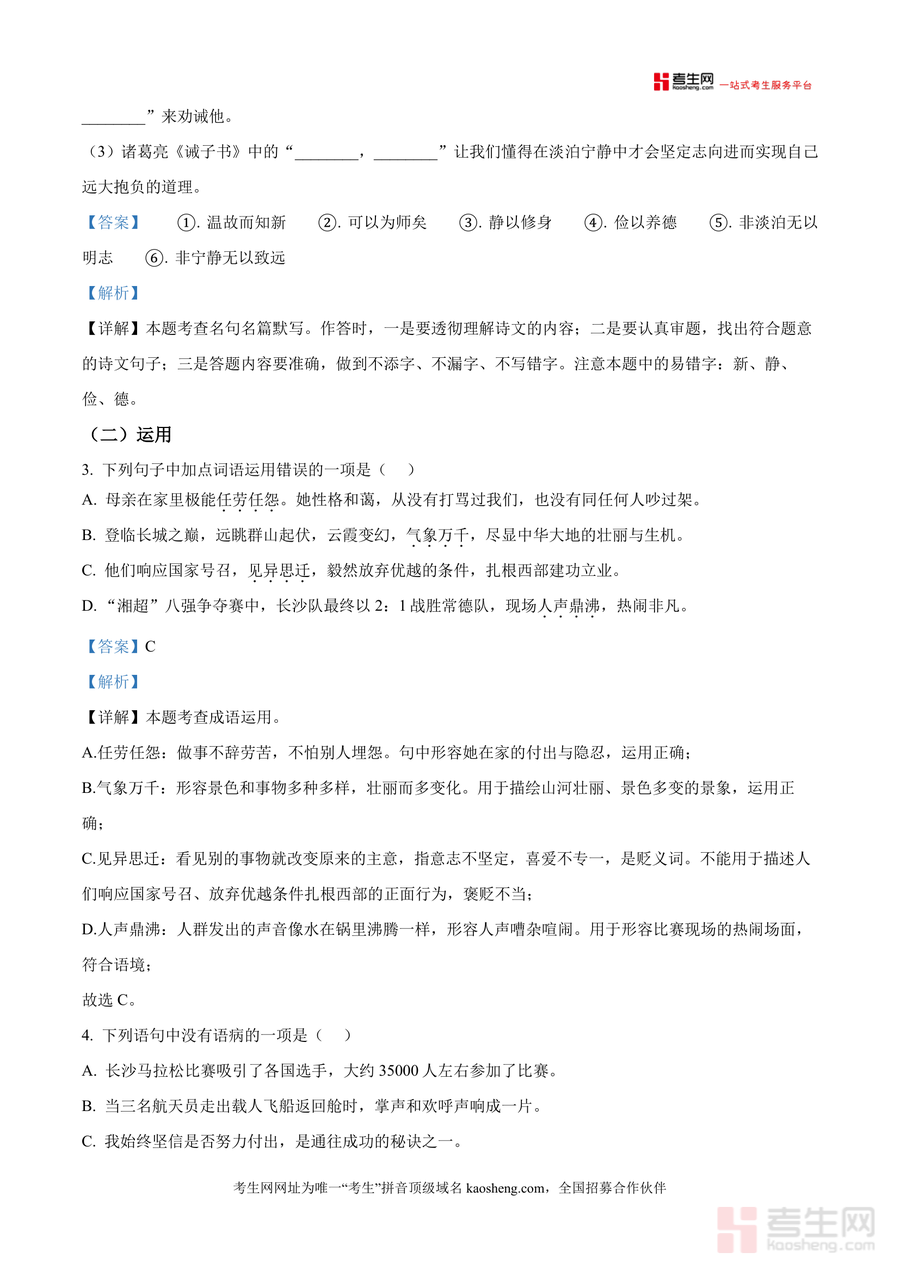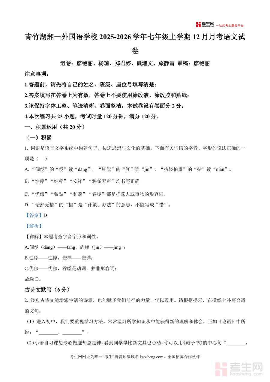 《精品解析:湖南省长沙市开福区青竹湖湘一外国语学校2025-2026学年七年级上学期12月月考语文试题(解析版)(1).docx》是一份针对七年级上学期语文阶段检测的真题解析类备考资料,涵盖积累运用(字音字形、古诗文默写)、非文学类文本阅读及综合性学习等核心模块,特色在于每道题配备精准答案与深度解析:如字音字形题纠正错误读音书写(如"倜傥"误读"dǎng"、"憔瘁"错写),古诗文默写标注易错字(如"静以修身"之"静"),成语运用题明确褒贬不当(如"见异思迁"用于正面行为),解析贴合教材考点,为学生提供专业解题指引
