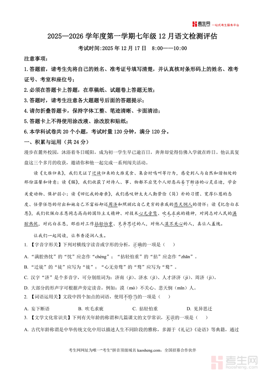 《精品解析:湖南省长沙市麓山国际部分学校2025-2026学年七年级上学期12月月考语文试题(原卷版)》是一份立足七年级上学期语文核心素养考查需求编制而成的高质量备考资料,主要涵盖积累与运用(含字音字形、词语运用、文学文化常识、诗文名句积累等基础模块)及阅读与鉴赏(含现代文阅读理解等能力模块)两大核心板块,依托麓山国际教育集团优质教研资源,命题规范贴合本地教学实际,能精准反映新课标要求下阶段性学习重点,具有较强参考价值与实用性,是兼具基础性与能力导向的优质真题资料