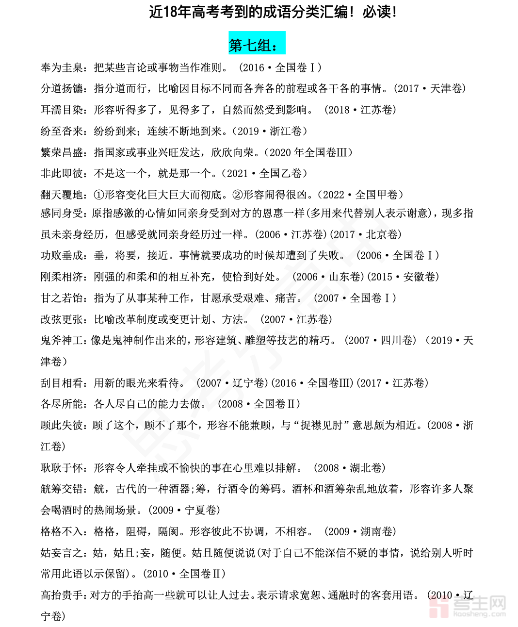 本资料为近 10 年必考语文正课成语汇编,依据全国中考真题与教材高频考点整理,收录多年持续考查的核心成语。每则成语标注释义、用法、感情色彩及易错点,重点区分近义、易混成语,搭配典型例句与考场误用提醒,贴合基础题、阅读、写作等多场景使用。内容精简、重点突出、实用性强,方便学生快速记忆、规范运用。适合日常积累、专项训练、考前冲刺与查漏补缺,助力学生扎实掌握成语考点,提升语言运用与应试得分能力,为语文备考提供高效实用的素材支持。