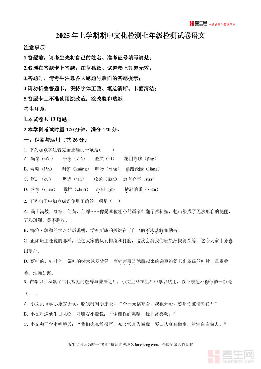 《精品解析:湖南省长沙市宁乡市西部六乡镇2025-2026学年七年级上学期期中语文试题(原卷版).docx》是一份聚焦区域学情、贴合课标要求的七年级语文期中标准化真题资料核心内容覆盖积累与运用(含字音字形、成语运用、敬谦辞辨析等基础题型)、阅读与理解(含古诗词赏析、文言文对比阅读、非文学作品及文学作品阅读等综合模块)及综合性学习三大板块题型设置严格遵循当地期中检测命题规范明确120分钟/120分的考试时长与分值分布包含答题卡使用规范等细节特色亮点在于精准匹配宁乡西部六乡镇教学进度与考点侧重原卷呈现真实考试情境助力学生提前熟悉答题流程与评分标准
