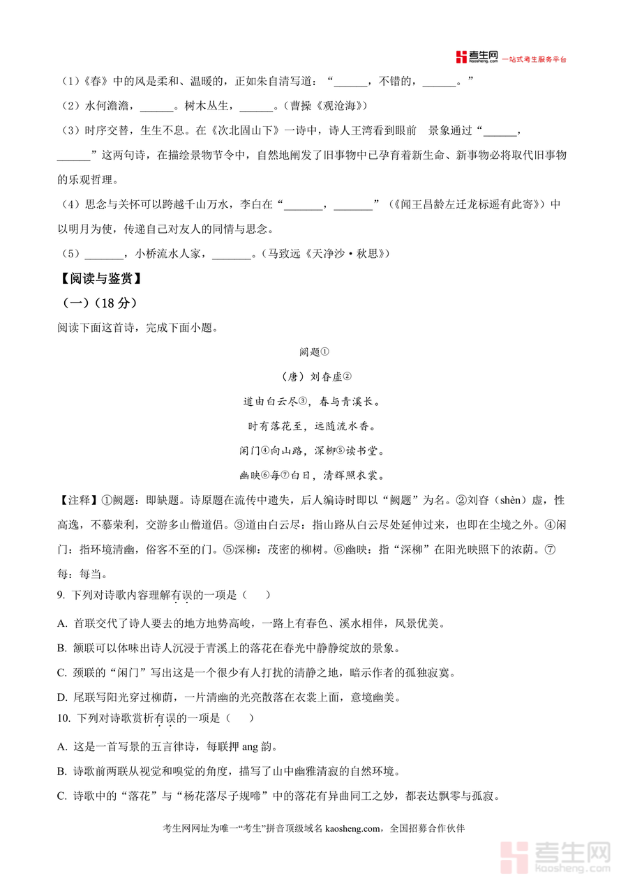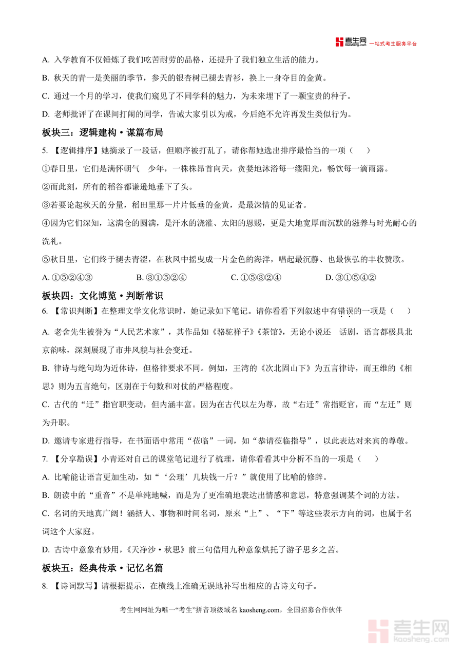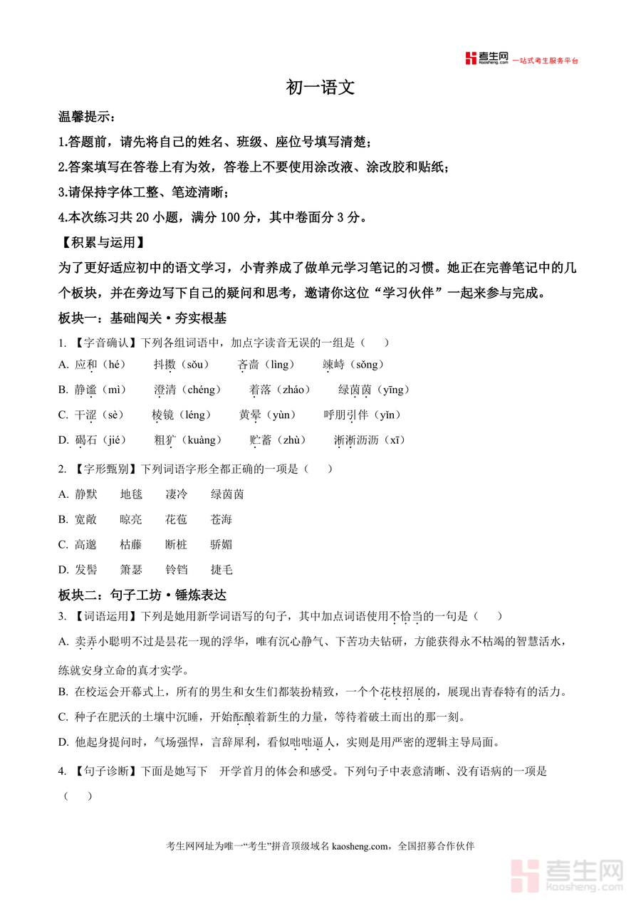 《精品解析:湖南省长沙市开福区青竹湖湘一外国语学校2025-2026学年七年级上学期10月月考语文试题(原卷版).docx》是一份针对七年级上册语文阶段性学习设计的优质备考资料,核心定位为名校月考真题原卷,涵盖积累与运用、阅读与鉴赏两大核心板块,包含字音字形甄别、词语运用、句子诊断、逻辑排序、文学常识判断、诗词默写及古诗与现代文阅读等题型,特色亮点在于贴合该校教学进度与考纲要求,全面覆盖初一上册语文基础与能力要点,助力学生夯实根基、提升核心素养.