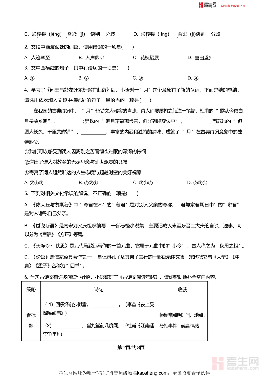 该资料可作为学生日常同步练习、考前模拟训练及教师备课参考的核心素材;使用场景覆盖课后知识点巩固(如古诗文意象分析、文化常识积累)、阶段性检测(模拟联考时间分配与题型结构);用户通过真题演练能有效提升应试能力(如快速识别语病类型、准确解读古诗文情感内涵),同时借助区域联考题型把握命题趋势;备考优势在于依托师大附中教育集团优质教研资源,题型设置科学且贴近长沙地区期中检测实际需求,助力学生高效查漏补缺,强化知识薄弱点。