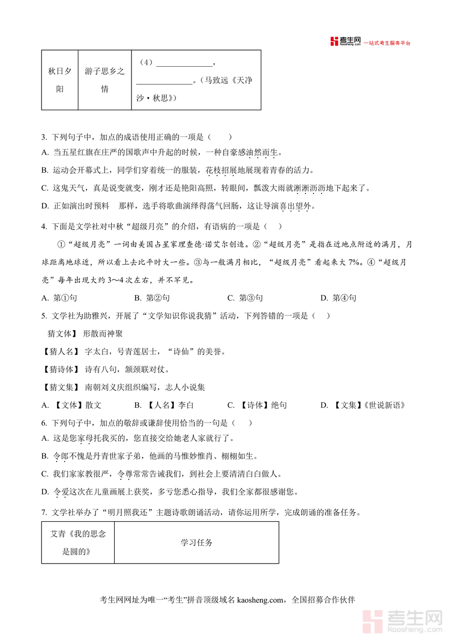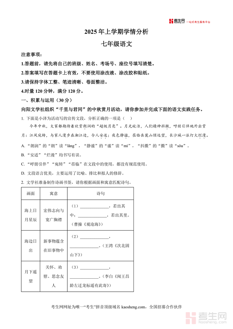 《精品解析:湖南省长沙市郡系2025-2026学年七年级上学期10月月考语文试题(原卷版)》是一份针对长沙郡系七年级上册语文阶段性学习设计的高质量备考资料,核心内容覆盖积累与运用(含字音字形、成语语病、文学常识等)、阅读理解(诗歌赏析、文言文阅读、文学作品阅读及名著阅读)、语言表达三大模块,全面贴合2025年上学期学情分析要求,保留真实月考场景的注意事项与时量分值设置,命题风格紧扣部编版教材课标与本地教学进度,能为使用者提供沉浸式练习体验。