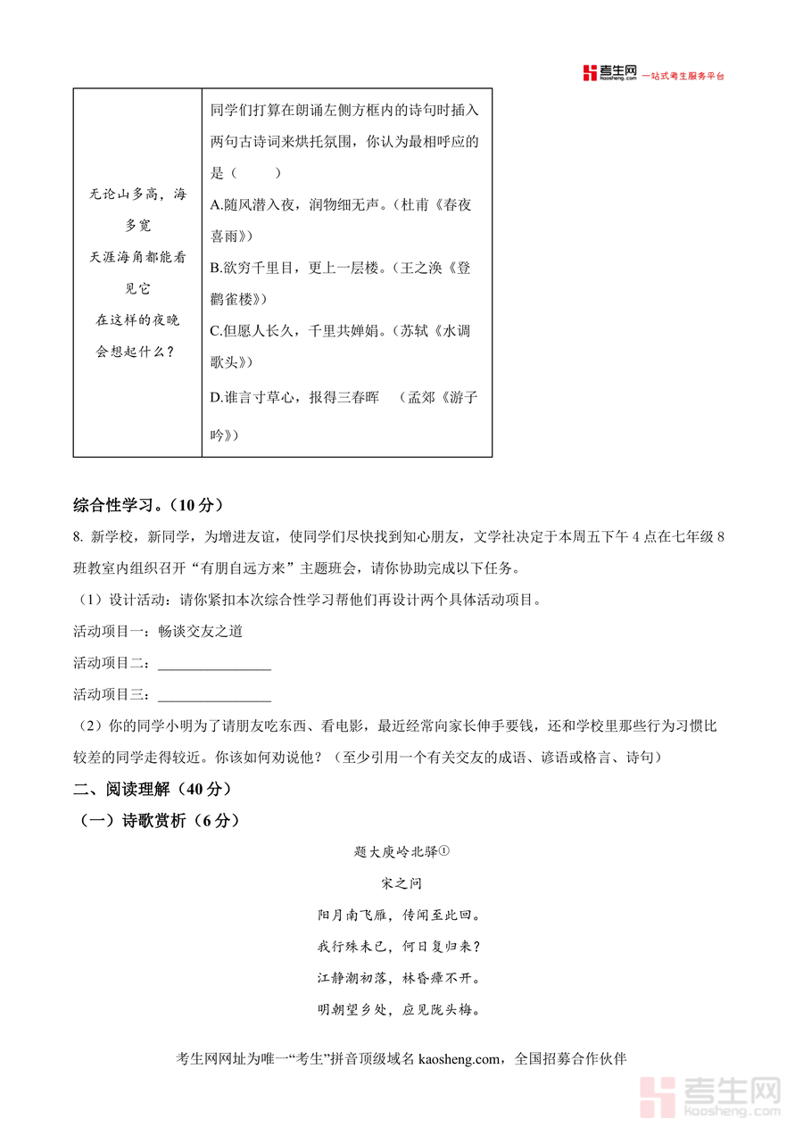 该资料核心用途为辅助学生检测阶段学习效果、巩固基础知识,使用场景包括学生课后自测以明确薄弱点,教师备课参考以优化教学方案,家长辅导孩子时作为针对性练习素材;其用户价值在于帮助学生熟悉郡系月考命题规律提升应试能力,为教师提供本地教学重点方向参考,让家长直观了解孩子学习状况;备考优势显著——原卷版设计还原考试氛围,助力使用者提前适应节奏,高效提升语文素养。