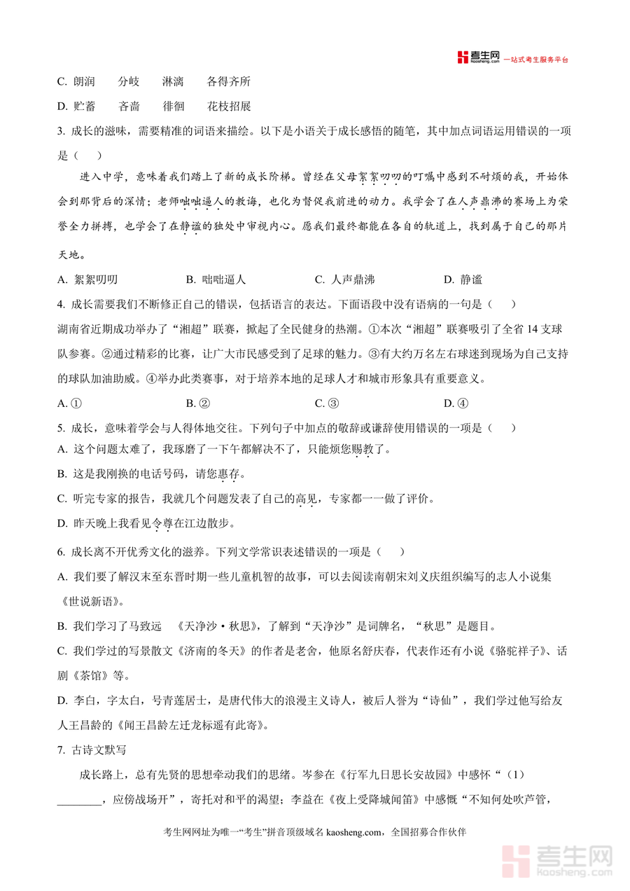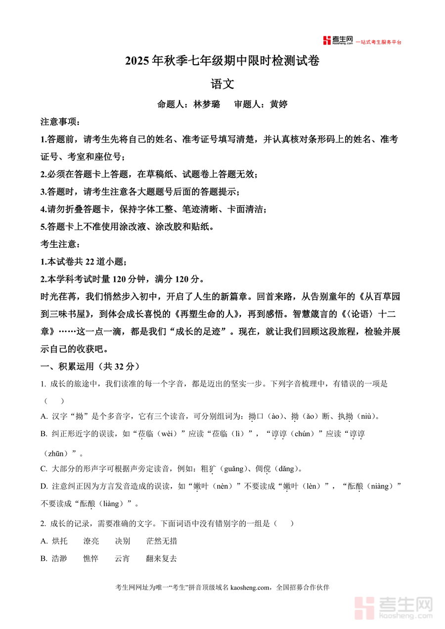 《精品解析:湖南省长沙市长郡集团初中校2025-2026学年七年级上学期期中语文试题(原卷版)docx》是一份由长郡集团资深命题团队编制七年级语文期中备考核心资料其内容严格遵循部编版七年级上册语文教学大纲涵盖积累运用(字音字形词语运用语病修改文学常识古诗文默写综合性学习)文学作品阅读古诗文阅读三大板块题型设置贴合期中检测标准全面覆盖本学期重点知识点精准反映长郡集团先进教学理念与命题方向