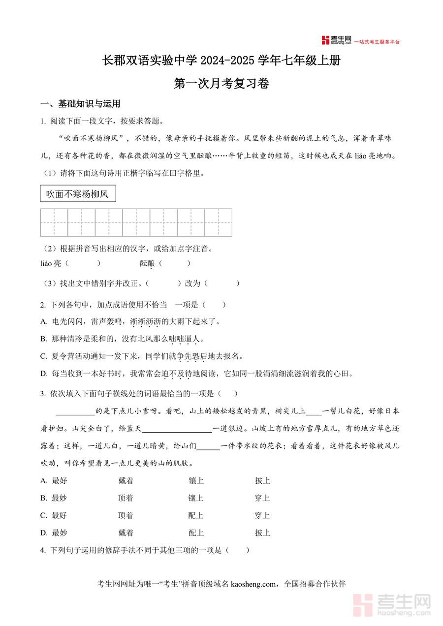 《精品解析:湖南省长沙市长郡双语实验中学2024-2025学年七年级上学期第一次月考语文试题(原卷版)》是一份聚焦七年级语文阶段性学习成果检测的高质量备考资料,涵盖基础知识与运用、名句名篇默写、综合性学习、诗歌鉴赏、现代文阅读及作文六大核心模块,精准匹配部编版教材七年级上册前半学期教学重点与核心素养要求;依托长郡双语实验中学优质教研资源设计,题型兼顾基础积累与能力提升,并贴合初中语文命题趋势,能有效暴露学生在字词规范、文本理解等方面薄弱点.