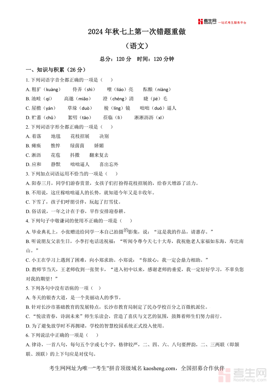 《精品解析:湖南省长沙市长郡梅溪湖中学2024-2025学年七年级上学期第一次月考语文试题(原卷版).docx》是一份聚焦七年级上学期语文核心知识点与应试能力培养的名校真题原卷资料。文件涵盖知识与积累、阅读与理解、写作与表达三大模块,包含字音字形辨析、病句修改、敬谦词使用等基础题型及诗歌鉴赏、文言文对比阅读、文学文本分析等综合题型;其特色在于严格遵循新课标要求与长郡梅溪湖中学教学体系,题型设置贴合七年级学生认知水平,能精准反映首次月考考查重点。