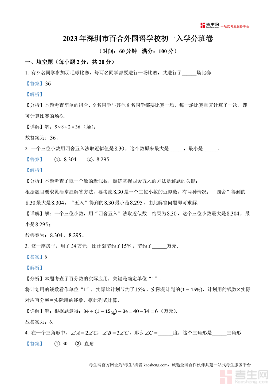 《精品解析:广东省深圳市百合外国语学校2023--2024学年七年级上学期入学分班考试数学试卷(解析版)》是一份针对百合外国语学校初一入学分班考试的专业备考资料,包含完整试卷原题及逐题详细解析,覆盖填空题、选择题、判断题、计算题及应用题五大题型。每份题目解析均结合考点分析、解题思路推导及易错点提示,如填空题中组合问题、四舍五入法应用等核心考点均有深度拆解,并总结同类题型解题技巧,助力学生掌握真题解析中的关键方法。