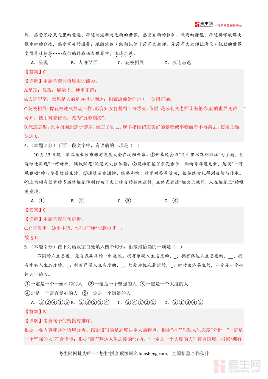 该资料核心用途为辅助学生进行第一次月考备考,适用场景包括课堂限时模拟训练、课后自主复习巩固、考前针对性查漏补缺;用户价值体现在通过真实模拟题型熟悉考试节奏,借助详尽解析掌握解题技巧提升应试能力;备考优势在于贴合长沙本地命题风格,解析深度覆盖知识点本质,如名句默写题标注易错字词,综合运用题提供仿句及自我介绍范例,助力学生高效突破薄弱环节实现针对性提升。