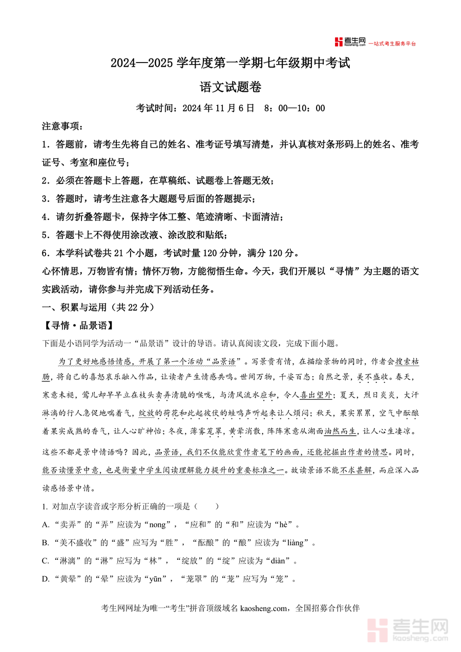 《精品解析:湖南省长沙市一中教育集团2024-2025学年七年级上学期期中语文试题(原卷版)》是一份极具权威性与实用性的七年级语文期中备考资料。该资料完整呈现了长沙市一中教育集团2024年11月期中语文考试原卷内容,并辅以深度解析指导服务体系构建。其主要内容覆盖积累与运用(字音字形辨析、病句修改等)、阅读与鉴赏(古诗文赏析、现代文阅读理解等)、综合性学习等核心板块,全面贴合七年级上学期语文教学大纲要求与考试趋势。特色亮点在于其依托一线名校教育集团的优质命题资源,并通过结构化呈现方式,帮助用户精准把握考点分布与题型特征。