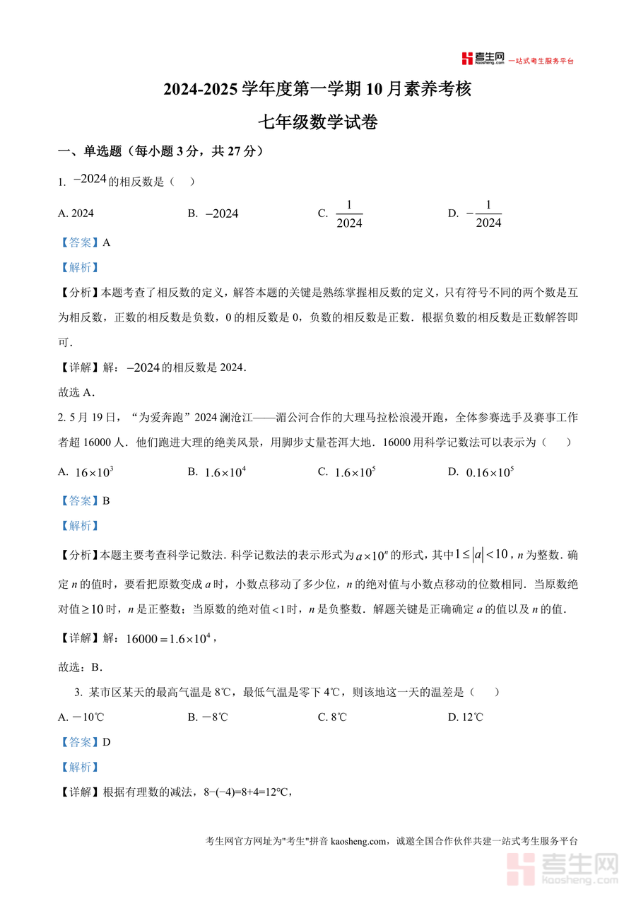 《精品解析:广东省深圳市龙华区清泉外国语学校 2024-2025学年七年级上学期数学10月月考试题(解析版)》是一份针对该学校七年级上册数学阶段性检测的精准真题解析资料。文件涵盖单选题、填空题、解答题三大题型共21道试题,内容聚焦相反数、科学记数法、有理数运算及应用等核心考点。其特色亮点在于每道题均配备详细考点分析、分步解题过程及易错点提示,同时结合深圳龙华区本地教学要求,将抽象知识点与实际应用场景结合,帮助学生深入理解知识本质与解题逻辑,为后续学习筑牢基础。