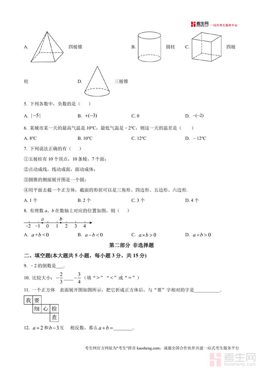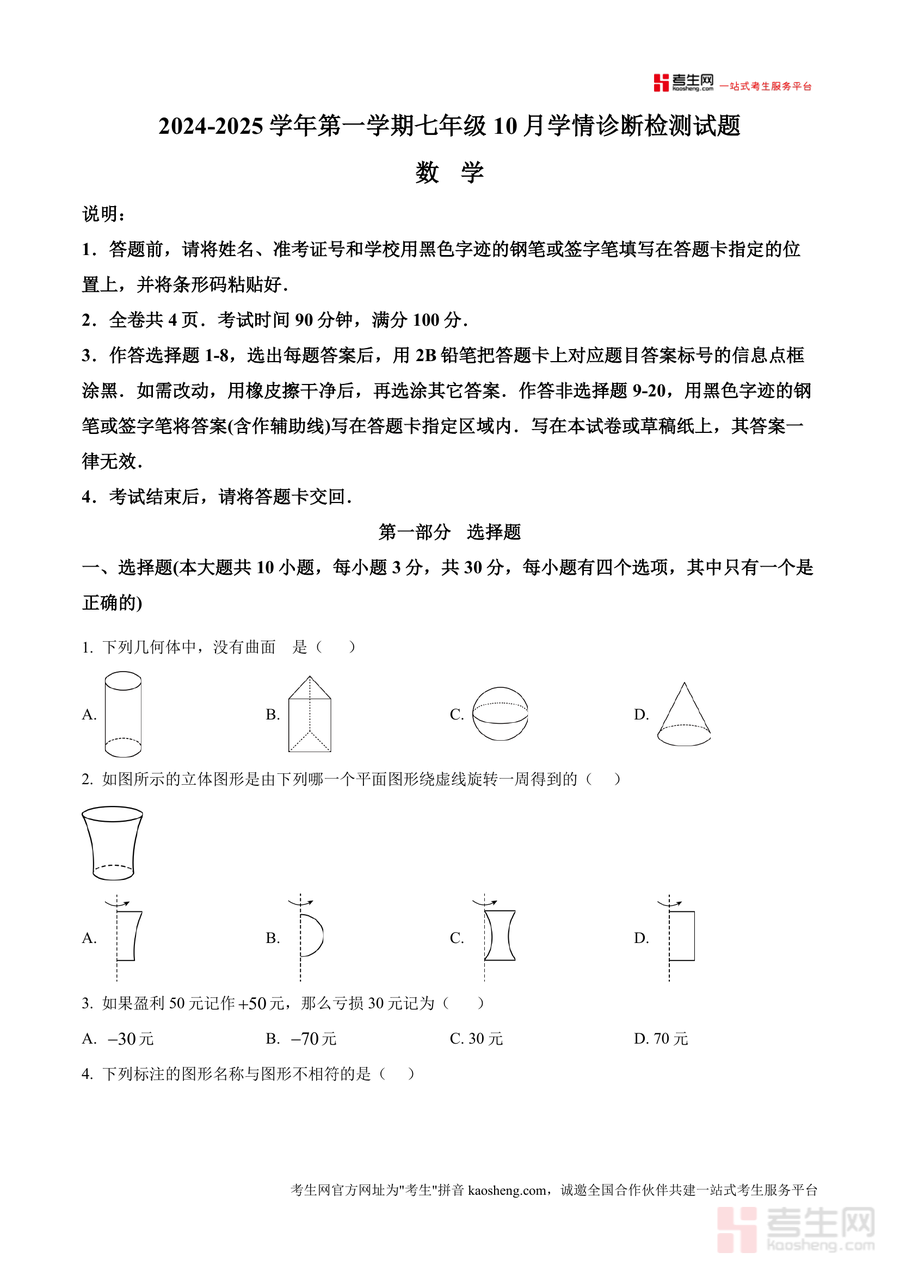 《精品解析:广东省深圳市龙岗区上海外国语大学附属龙岗学校2024—2025学年度七年级数学10月月考卷(原卷版).docx》是一份针对七年级上册数学阶段性检测设计的权威备考资料。该文件完整呈现了该校2024年10月月考数学原卷内容,包含考试说明(如答题规范、90分钟时限、100分满分)及三大题型模块:选择题(10小题共30分)、填空题(5小题共15分)、解答题(7小题共61分)。其特色亮点在于依托优质校教学资源,题型覆盖有理数运算、几何初步(几何体识别与展开图)、数轴应用等核心知识点,并贴合深圳本地教学进度与考试要求,为学生提供真实可靠的真题训练素材。