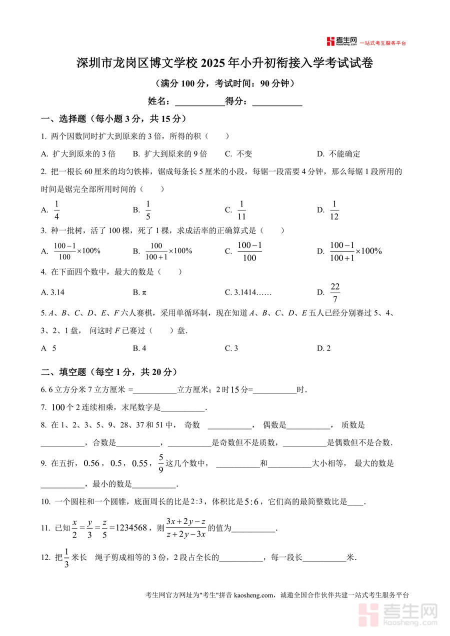 《精品解析:广东省深圳市龙岗区博文学校2025年小升初衔接入学考试数学试卷(原卷版)》是一份针对博文学校小升初衔接阶段入学评估设计的数学备考资料。该试卷严格遵循深圳龙岗区小升初数学衔接考试大纲要求,包含选择题(15分)、填空题(20分)、计算题(24分)、图形面积题(16分)及应用题(25分)五大模块,覆盖因数积变化规律、成活率计算、圆柱圆锥体积比等核心知识点,题型设置贴合本地校情与衔接考试命题趋势,能直观反映衔接阶段数学能力要求。