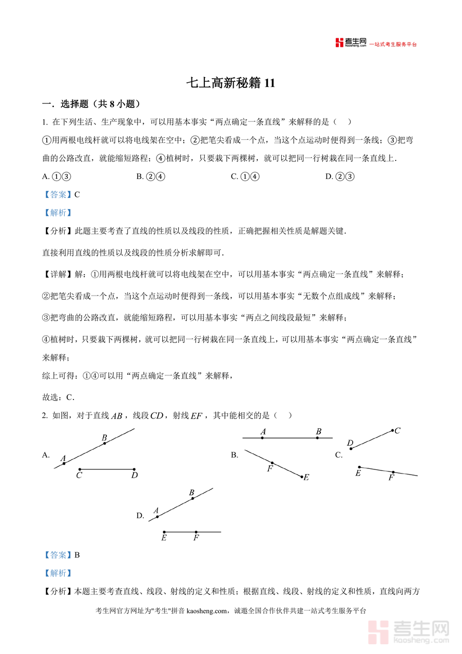 《精品解析:广东省深圳市南山外国语学校高新中学2025-2026学年七年级上学期第三次月考数学卷(解析版)》是一份针对七年级上学期数学阶段性检测需求的高质量备考资料。该资料包含完整月考真题及逐题详细解析,覆盖几何图形性质(如直线与射线相交判断)、角度计算(三角板叠放角度)、一元一次方程解法、统计调查等核心知识点,特色在于解析过程紧密结合教材概念与解题技巧,如对"两点确定一条直线"等基本事实应用场景分析,帮助学生建立知识与题型间逻辑联系。