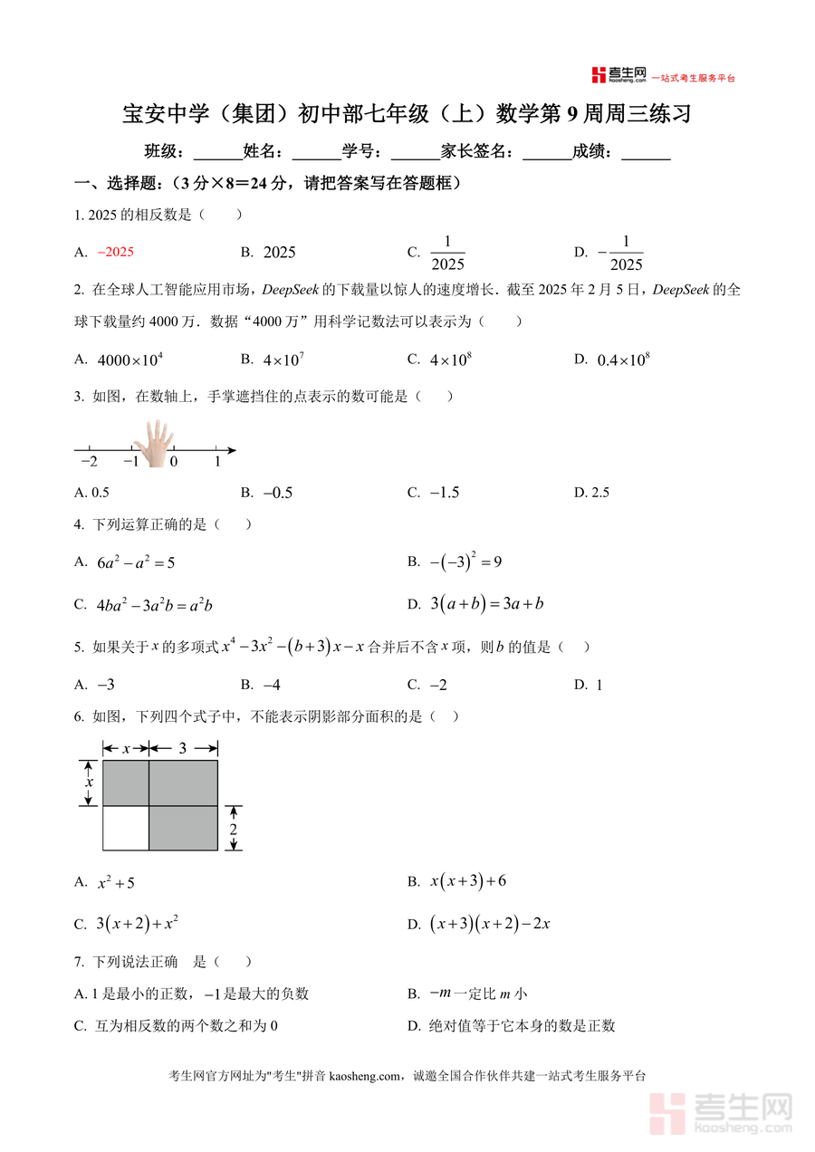 《精品解析:广东省深圳市宝安中学(集团)初中部2025-2026学年七年级上学期第9周周测数学试卷(原卷版).docx》是一份针对七年级上册数学阶段性学习成果检测的优质备考资料,包含8道选择题、5道填空题及5道解答题,覆盖相反数、科学记数法、数轴表示、整式运算、几何图形表面积计算、规律探究等核心知识点,题型设置贴合第9周教学进度,精准反映该校阶段性教学重点与考查方向。作为宝安中学(集团)初中部真实周测原卷,其题目设计具有较强针对性与代表性,能有效帮助学生把握知识应用场景与考查形式,为后续真题解析与针对性复习奠定基础。