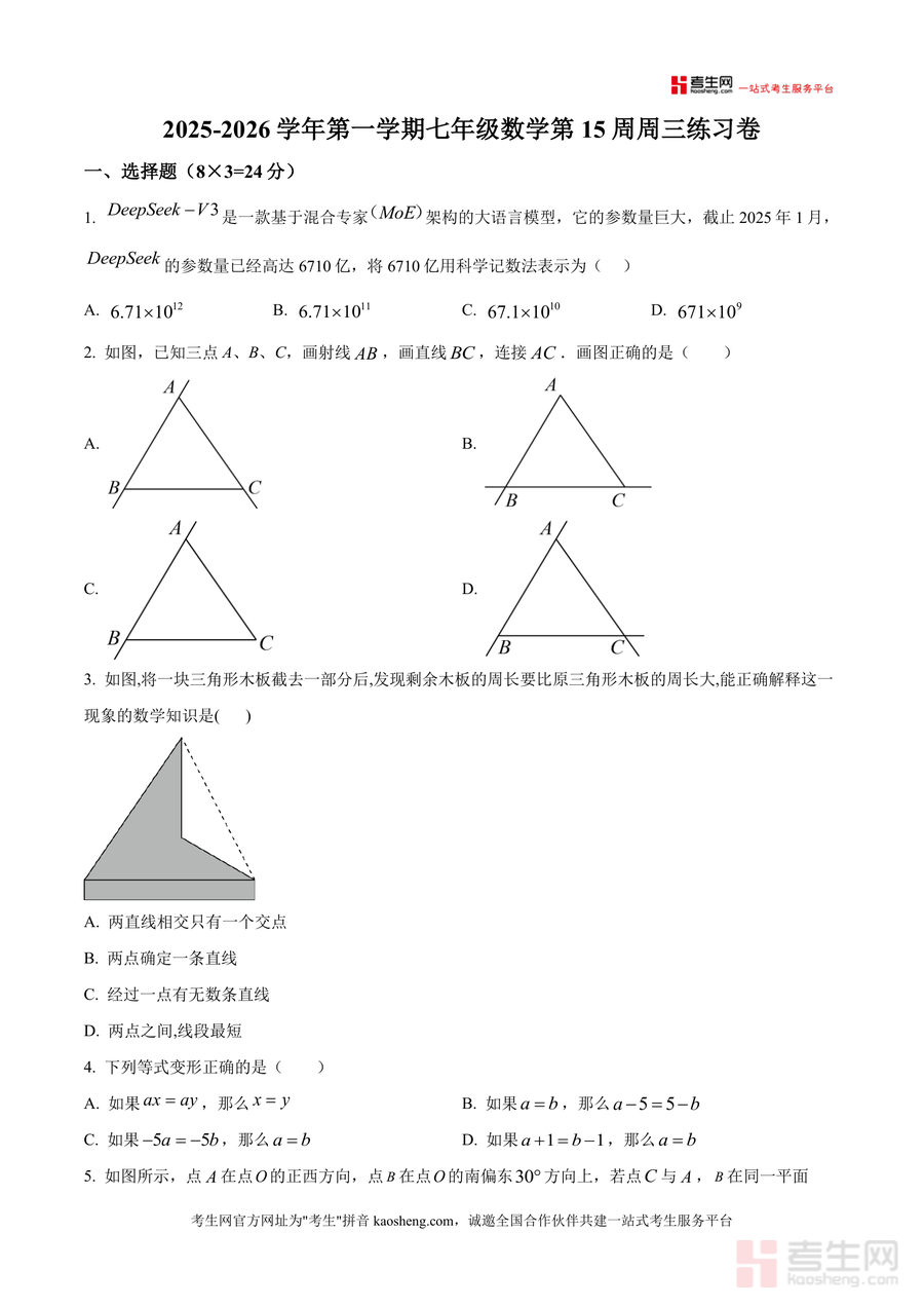 本资料适用于深圳市宝安中学及周边同类学校的七年级学生、数学教师及学生家长。作为该校实际教学中的周测试卷,其内容具有不可替代性:精准匹配本地教学进度与考试方向;长期来看,通过练习该试卷,学生可巩固核心知识点,培养逻辑思维与应用能力,为后续初中数学学习奠定坚实基础,是提升数学成绩与应试能力的必要资料。