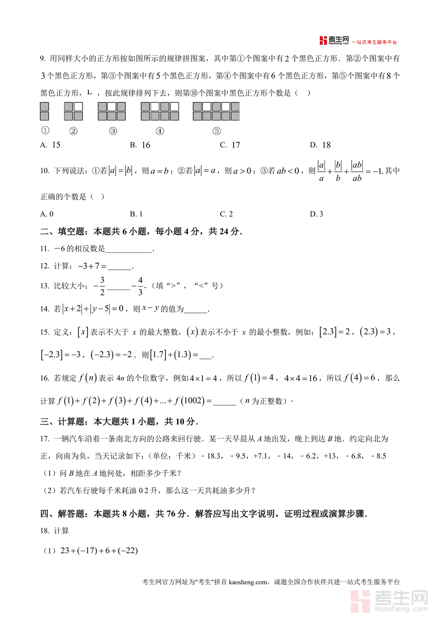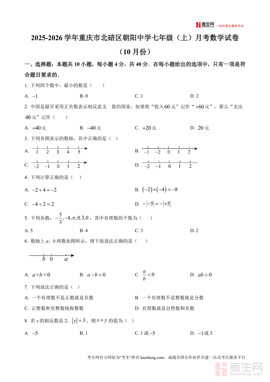 《精品解析:重庆市北碚区朝阳中学2025-2026学年七年级上学期10月月考数学试卷(原卷版)》是一份针对该校七年级学生数学月考备考设计的权威真题资料。该试卷严格贴合七年级上册数学教学进度与重庆北碚区本地考纲要求,涵盖有理数概念、相反数与绝对值运算、数轴应用、新定义运算及规律探究等核心知识点;题型结构完整清晰——含选择题(10小题40分)、填空题(6小题24分)、计算题(1小题10分)及解答题(8小题76分),既包含基础巩固类题目如相反数求解、有理数比较大小等,也设置能力提升类题目如数轴综合分析、实际应用问题(汽车行驶耗油计算)、规律探究题(黑色正方形图案排列)等特色题型。