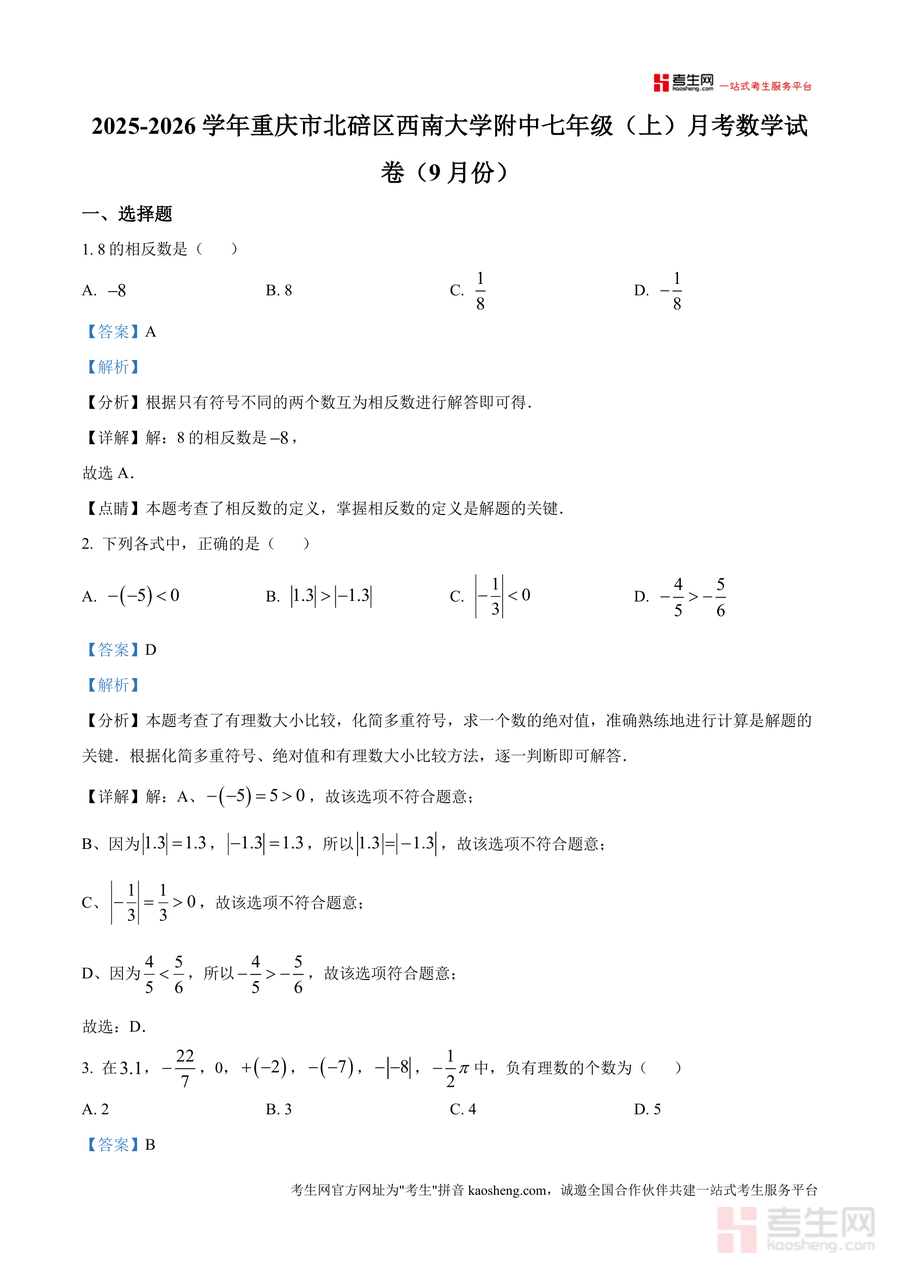 《精品解析:重庆市北碚区西南大学附属中学校2025-2026学年七年级上学期月考数学试卷(9月份)(解析版).docx》是一份针对西南大学附中七年级新生入学后首次月考设计的松值深度解析资料。该资料完整收录本次月考全部题型(选择题、填空题、解答题三大类)及对应详细解析,覆盖有理数概念与运算、数轴应用、代数式求值、一元一次方程等七年级上册核心知识点;解析部分突出考点定位(如相反数定义应用、钟面角计算逻辑),拆解解题步骤(如新定义运算"⊗"规则应用),并标注易错点与答题技巧,贴合附中命题风格与教学要求,助力学生把握考点本质。