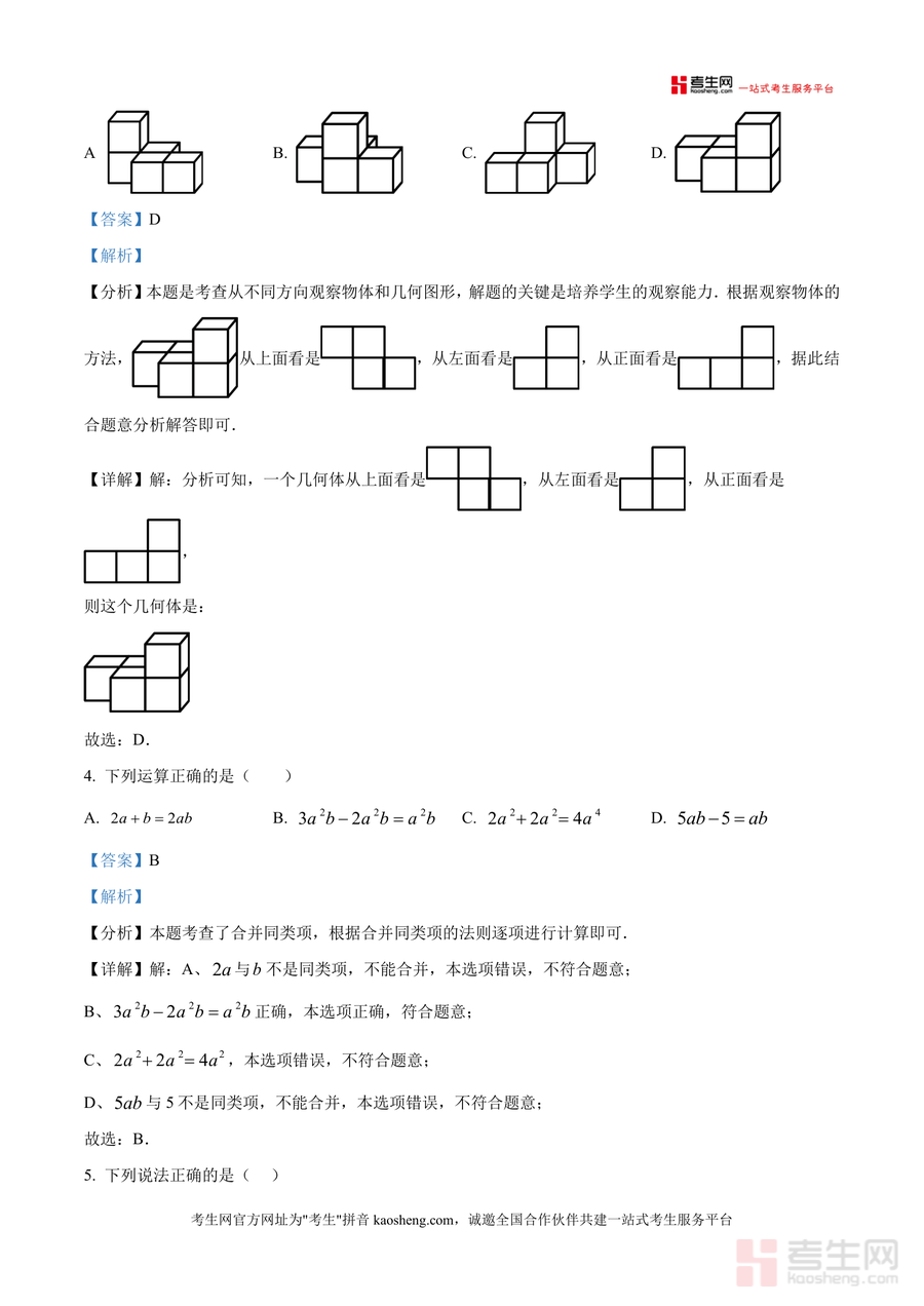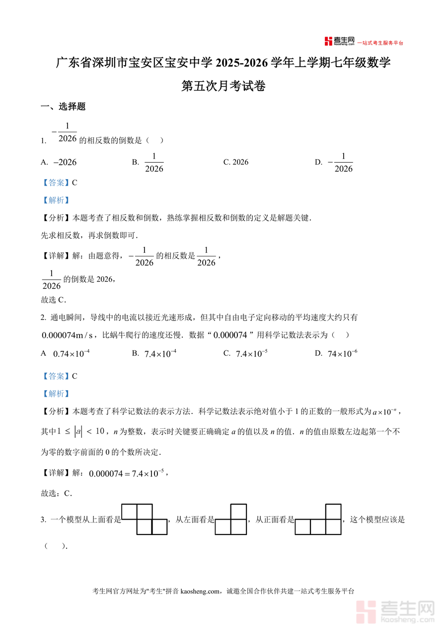 《精品解析:广东省深圳市宝安区宝安中学2025-2026学年上学期七年级数学第五次月考试卷(解析版).docx》是一份针对七年级数学阶段性检测设计的专业备考资料,聚焦宝安中学第五次月考真题展开深度解析。文件涵盖选择题、填空题、解答题三大题型,覆盖相反数与倒数运算、科学记数法表示、三视图识别、合并同类项法则等核心考点;每道题配备详细分析与步骤详解,标注考点类型,帮助使用者快速定位知识薄弱点,实现精准复习。