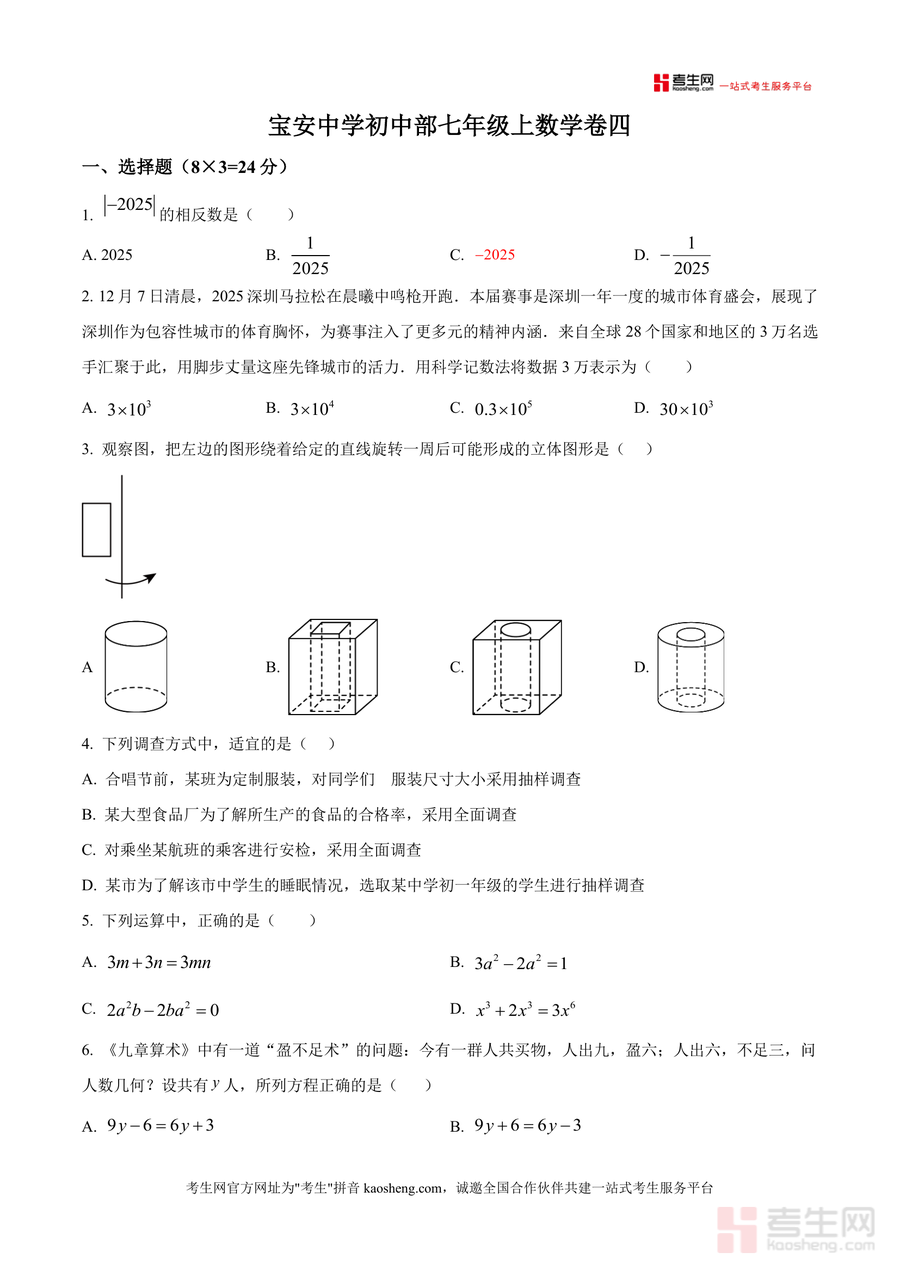 《精品解析:广东省深圳市宝安区宝安中学2025-2026学年上学期七年级数学第四次月考试卷(原卷版)》是一份针对七年级上学期数学学科阶段性检测需求设计的优质备考资料。该试卷涵盖代数基础(相反数、科学记数法、一元一次方程)、几何初步(立体图形旋转、线段与角平分线)、统计与概率(调查方式选择、统计图分析)等核心模块,题型包含选择题、填空题及解答题三大类,并融入深圳本地情境素材如深圳马拉松数据、远光世界广场面积计算等真实案例,既贴合教材知识点又体现地域特色。试卷结构严谨、梯度分明,能全面考查学生对七年级上册数学知识的掌握程度与应用能力。
