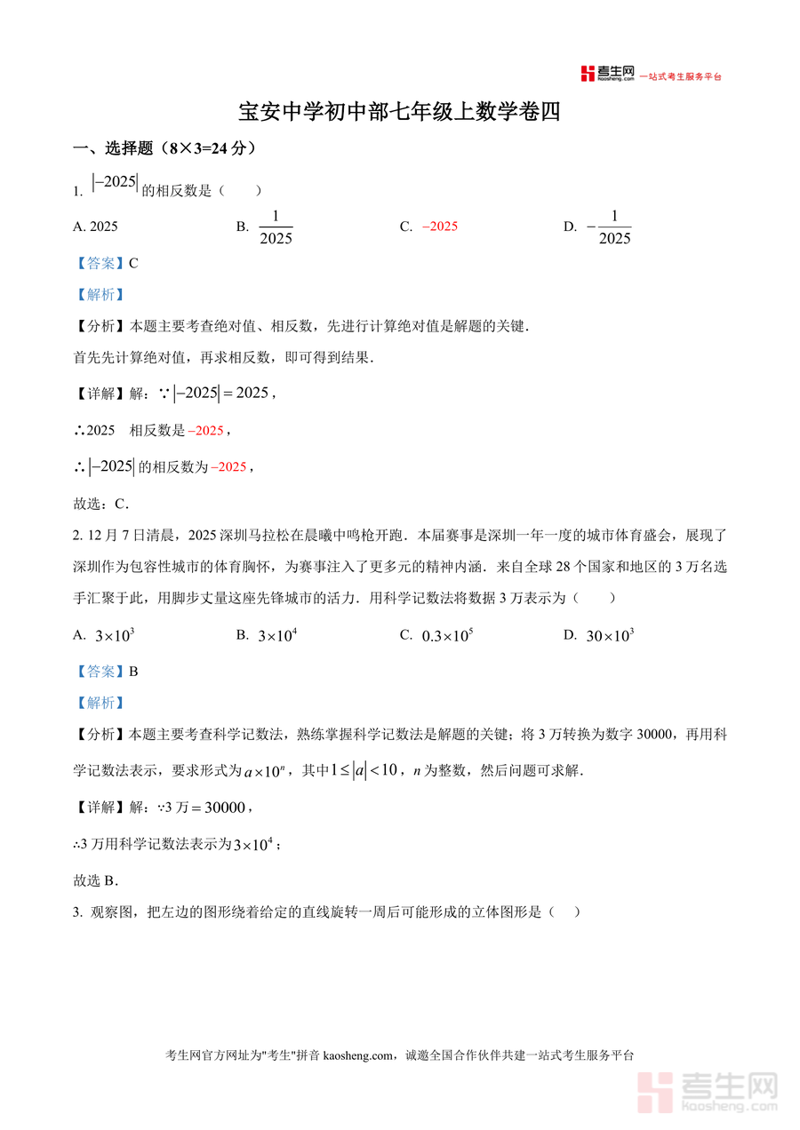 《精品解析:广东省深圳市宝安区宝安中学2025-2026学年上学期七年级数学第四次月考试卷(解析版)》是一份聚焦七年级数学阶段性复习需求打造优质备考资料。文件包含完整校考原题及逐题深度解析,覆盖有理数运算、一元一次方程、几何图形展开与角平分线等核心知识点,真题解析板块除标准答案外,还详细呈现解题步骤推导、考点定位及易错点警示,助力使用者精准把握校考命题逻辑与考查重点。