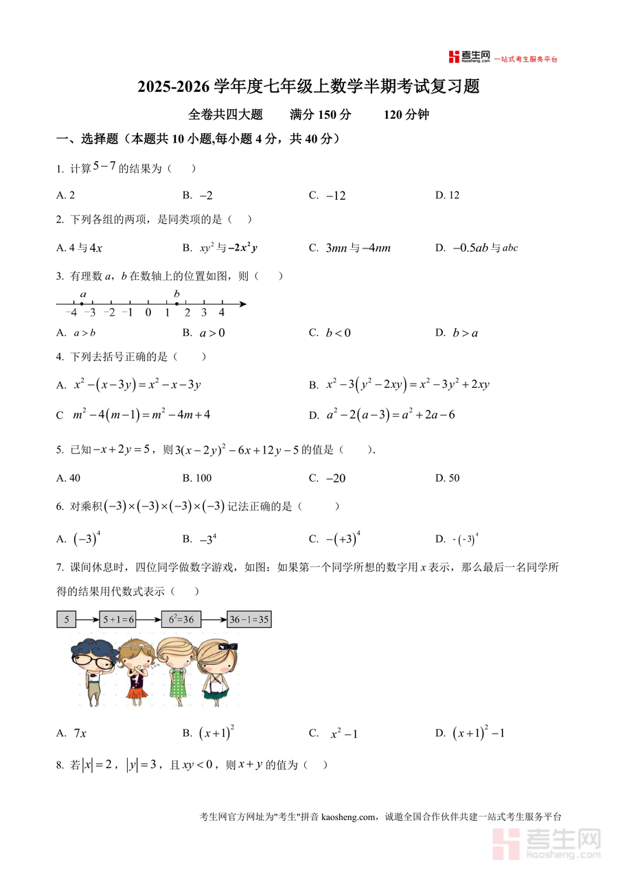 《精品解析:重庆市十八中教育集团观音桥中学2025—2026学年上学期七年级数学半期检测(原卷版)》是一份针对七年级上学期数学半期检测的优质备考资料与真题解析资源,核心内容包含四大题型共150分试题,覆盖选择题、填空题及解答题三大模块。该资料严格遵循校际联考命题标准,题型设置全面,既涵盖有理数运算、同类项识别、代数式化简等基础知识点题目,也包含数轴应用、规律探索、图形变换与代数结合等综合应用题。其特色亮点在于紧密贴合区域教学实际,试题难度梯度合理,能有效反映当前七年级数学教学的重点与难点,为学生提供真实考试场景下的训练素材,是兼具实用性与指导性的真题解析资料。