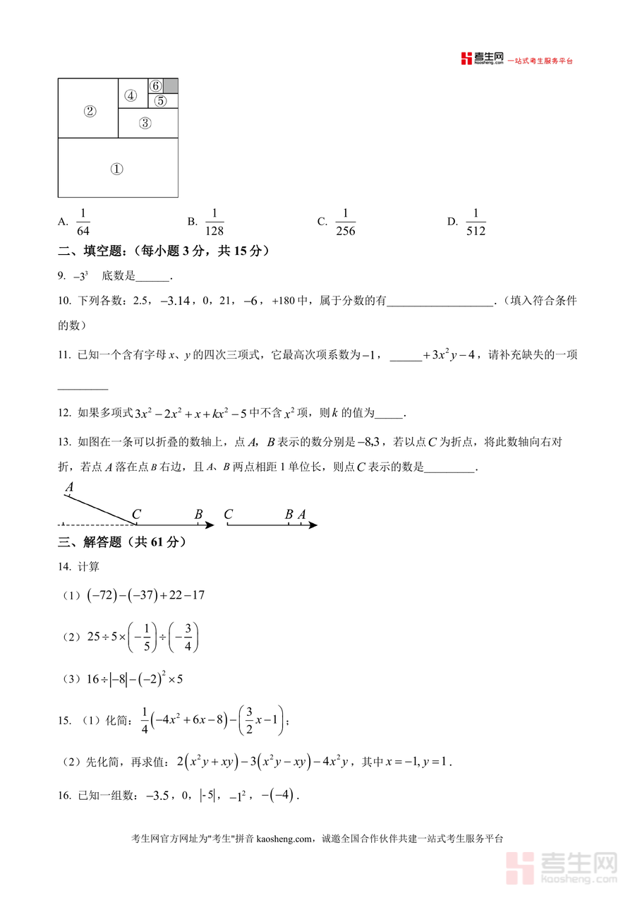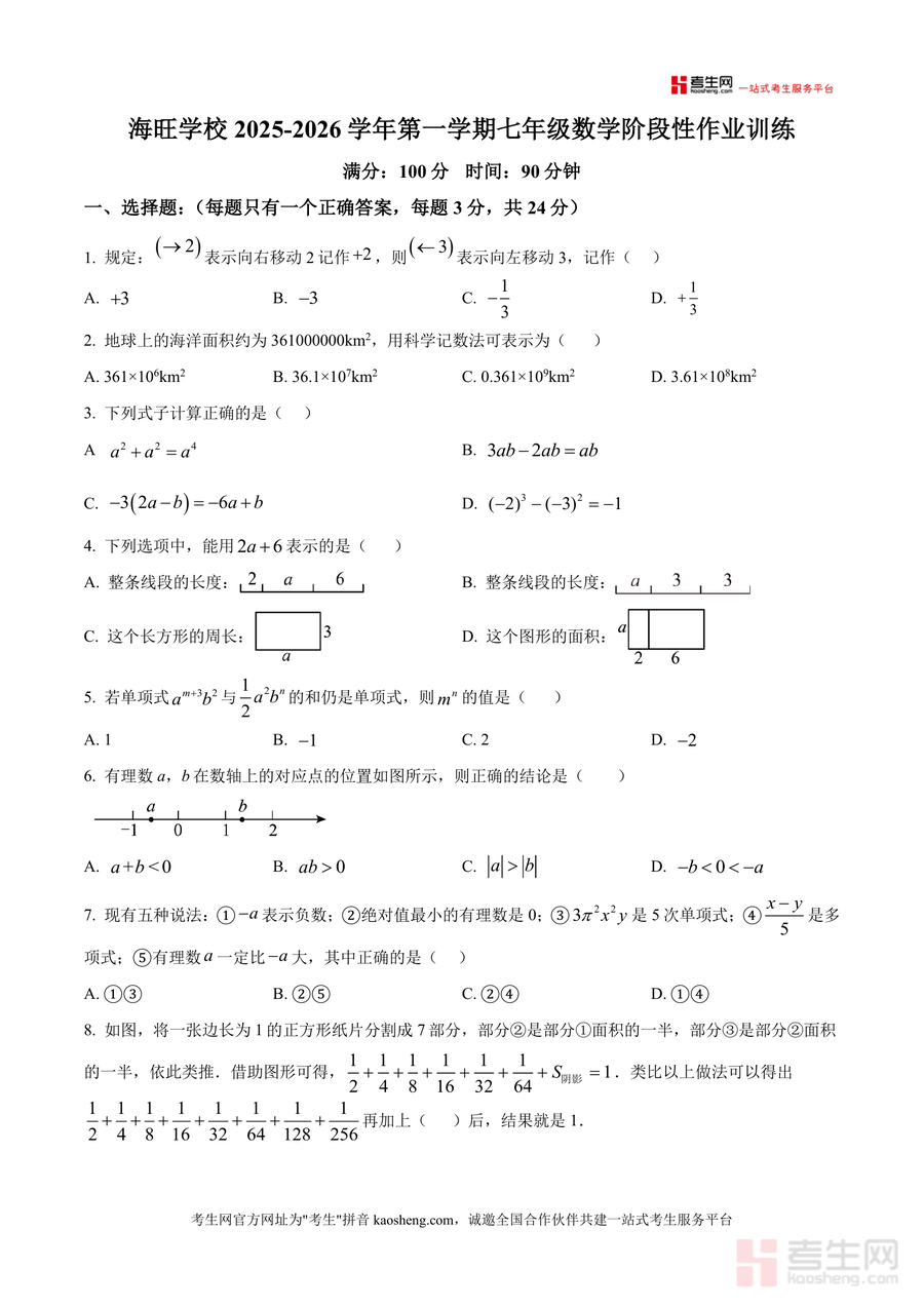 《精品解析:广东省深圳市宝安区海旺学校2025-2026学年上学期七年级数学10月阶段性作业训练(原卷版).docx》是一份针对七年级上学期数学阶段性学习成果检测的优质备考资料。该资料严格遵循深圳宝安区海旺学校教学进度与课标要求,涵盖有理数概念及运算、科学记数法、整式加减、数轴应用、实际问题建模等核心知识点,题型包括选择题(24分)、填空题(15分)与解答题(61分)三大模块。其特色在于真实还原学校阶段性测试的命题风格与难度梯度,并融入“整体思想”“数形结合”等数学思想方法训练题,助力学生深化对知识点的理解与应用。