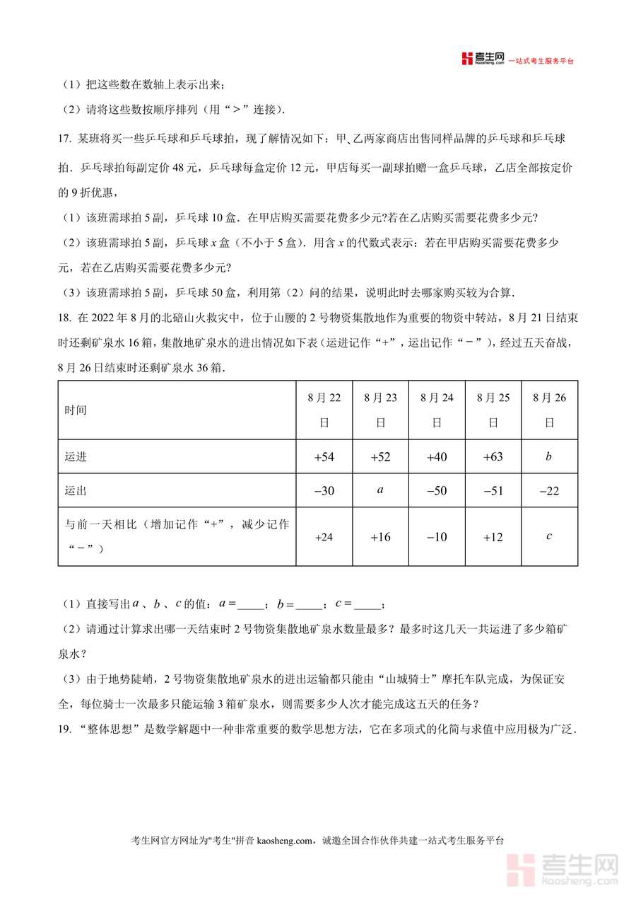 该资料核心用途为七年级学生进行阶段性知识巩固与自我检测、教师开展教学评估与习题设计参考。使用场景覆盖课后自主练习、单元复习强化、考前模拟训练等环节;对学生而言,可通过完成训练题精准定位知识薄弱点、熟悉考试题型结构与答题节奏;对教师而言,则能借助资料了解学生学习动态,优化教学策略。其备考优势在于贴合本地校情与学情,题目设置兼具基础性与拓展性——如解答题中包含实际购物优惠计算、山火救灾物资统计等生活化问题,既能巩固基础又能提升应试能力。