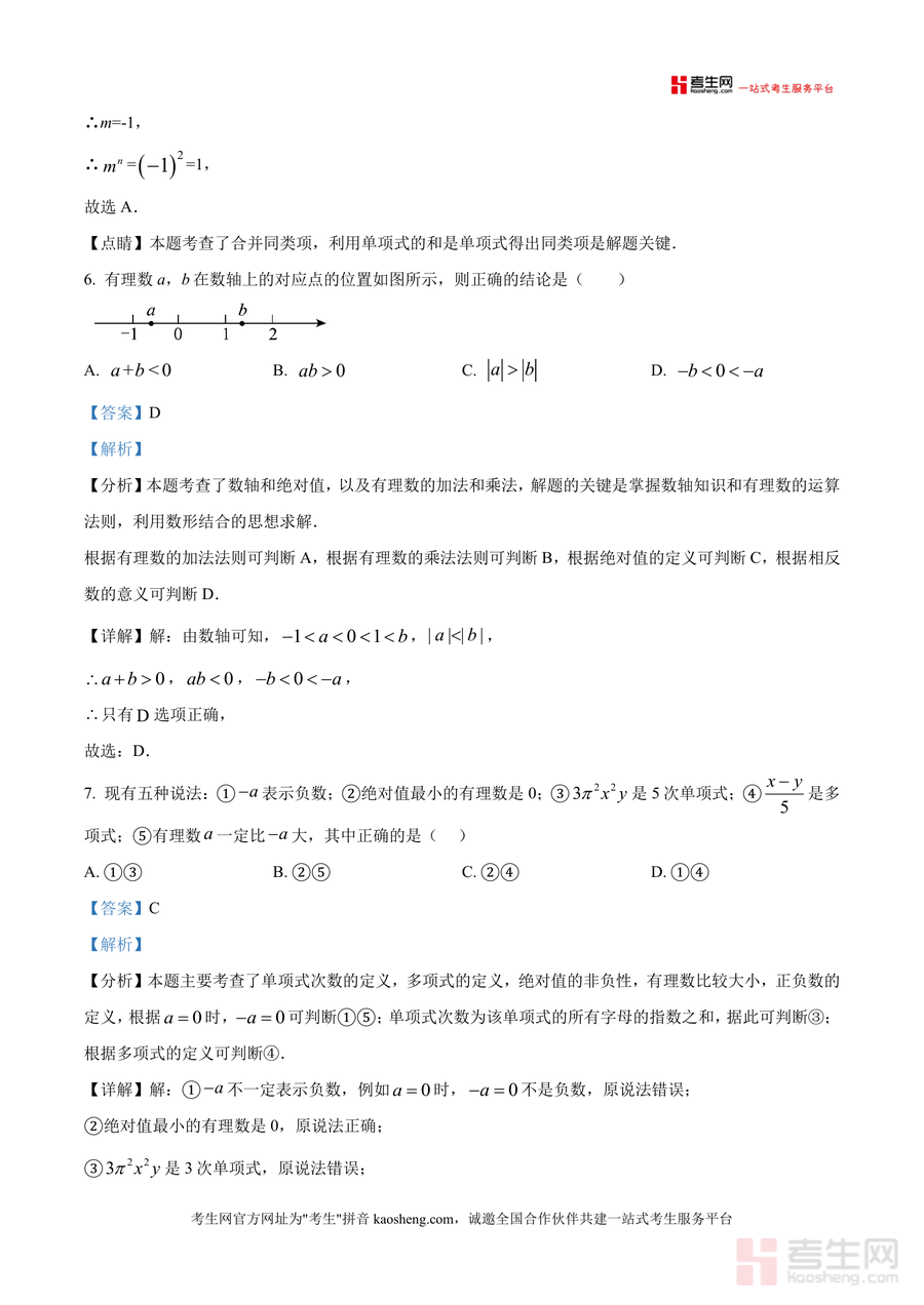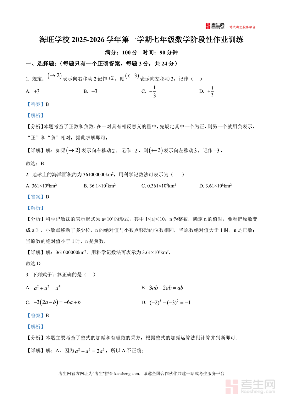 《精品解析:广东省深圳市宝安区海旺学校2025-2026学年上学期七年级数学10月阶段性作业训练(解析版).docx》是一份针对该校七年级学生数学阶段性学习评估与提升设计备考资料,涵盖正负数意义、科学记数法应用、整式加减运算、有理数混合运算等核心知识点。文件采用“题目+答案+详细解析”结构,每道题配备考点分析、解题思路及易错点提示——如选择题对同类项概念的深度拆解、填空题对多项式次数的精准解读。特色亮点在于贴合该校教学进度与学生认知特点设计训练题,并通过分层式解析引导思维迁移。