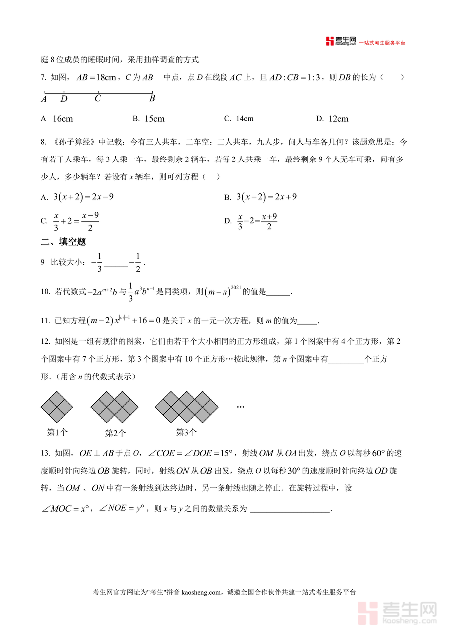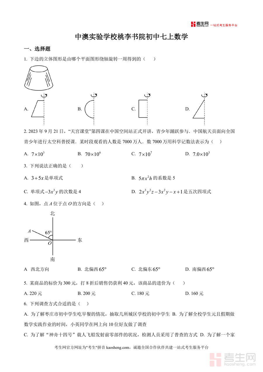 《精品解析:广东省深圳市桃源居中澳实验学校 2025-2026学年上学期七年级数学12月月考试题(原卷版).docx》是一份针对该校桃李书院初中七年级上册数学学科的阶段性检测真题资料,聚焦七年级上学期核心知识点与能力要求。资料涵盖立体图形旋转判定、科学记数法表示、单项式与多项式概念辨析、方向角识别、一元一次方程实际应用(商品利润计算、《孙子算经》经典问题)等基础题型,同时包含规律探究(正方形图案计数)、角度旋转动态问题、统计图表分析、线段计算拓展及角的分位线创新定义题等综合题型,全面覆盖整式运算、方程求解、几何图形初步、统计与概率四大模块,题型设置贴合该校教学进度与命题风格。