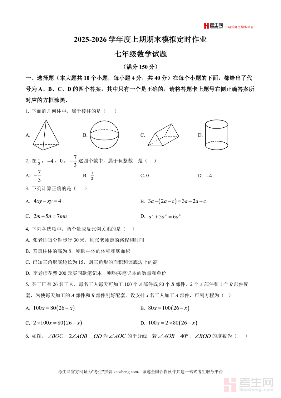 《精品解析:重庆市实验中学教育集团2025-2026学年七年级上学期1月月考数学试题(期末模拟定时作业)(原卷版)》是一份针对七年级上学期期末备考设计的标准化模拟试题资料。该资料严格遵循重庆市实验中学教育集团教学大纲及本地期末考纲要求,涵盖几何(棱柱识别、角平分线计算等)、代数(有理数运算、方程求解等)及应用题(配套问题、经济利润问题等)三大核心模块;题型设置包含选择题(10道)、填空题(6道)及解答题(9道),与本地期末考试题型结构高度一致;特色亮点在于融入该校真题题型风格及易错考点分析方向。