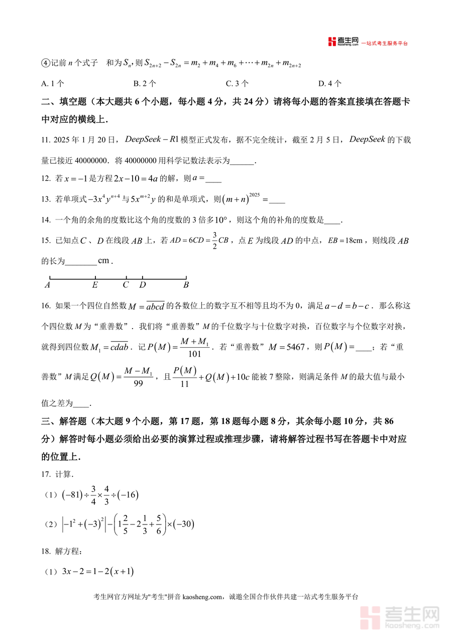 适用人群为重庆市实验中学教育集团及周边同类学校七年级学生、初中数学教师(用于教学参考或试题命制参考)及家长(辅助孩子进行针对性复习)。该资料作为期末模拟真题原卷版具有不可替代性——其贴合本地考情与学校教学特色,长期价值在于培养学生系统解题思维及规范答题习惯,是七年级学生提升数学成绩及应试能力的必要工具。
