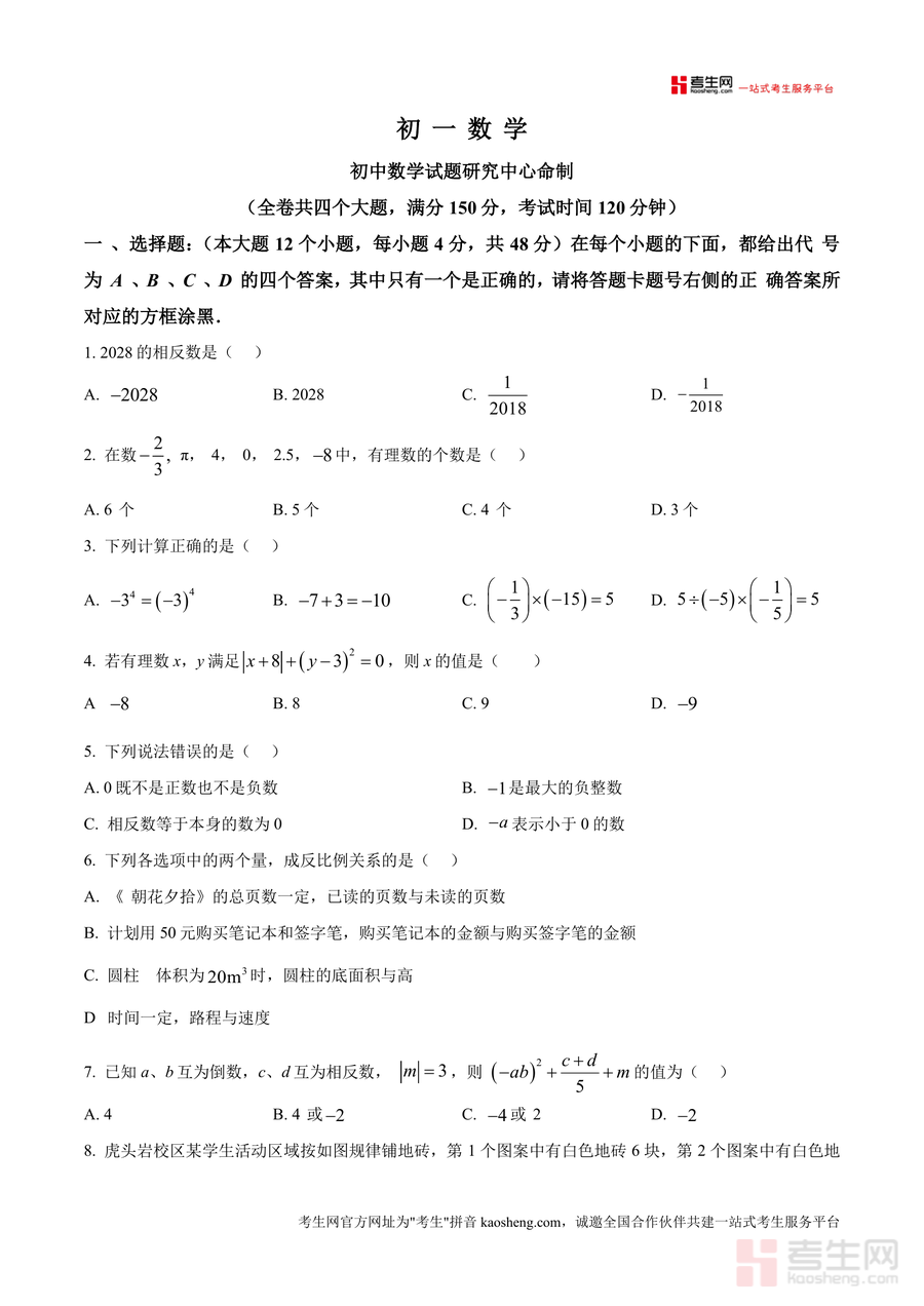 该资料适用于重庆市巴蜀中学及重庆地区同类初中七年级学生(尤其需备战10月月考者)、初中数学教师(用于教学参考或试题命制借鉴)以及关注孩子数学学习的家长;其必要性在于名校真题具有不可替代性,能真实反映阶段性学习要求;长期价值在于帮助学生构建扎实数学基础框架,培养逻辑思维与解题能力,为后续初中数学学习奠定坚实基础。