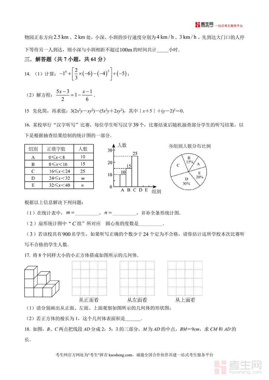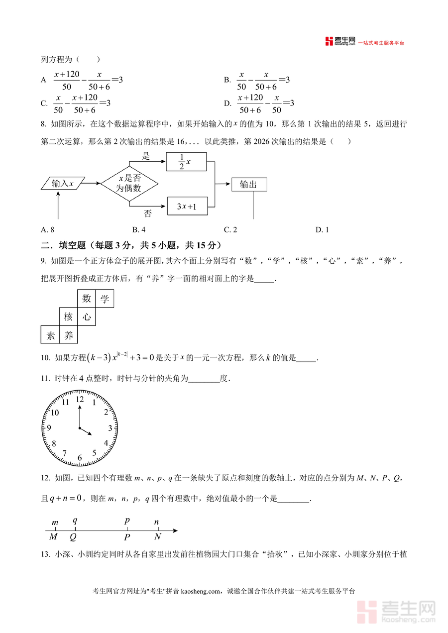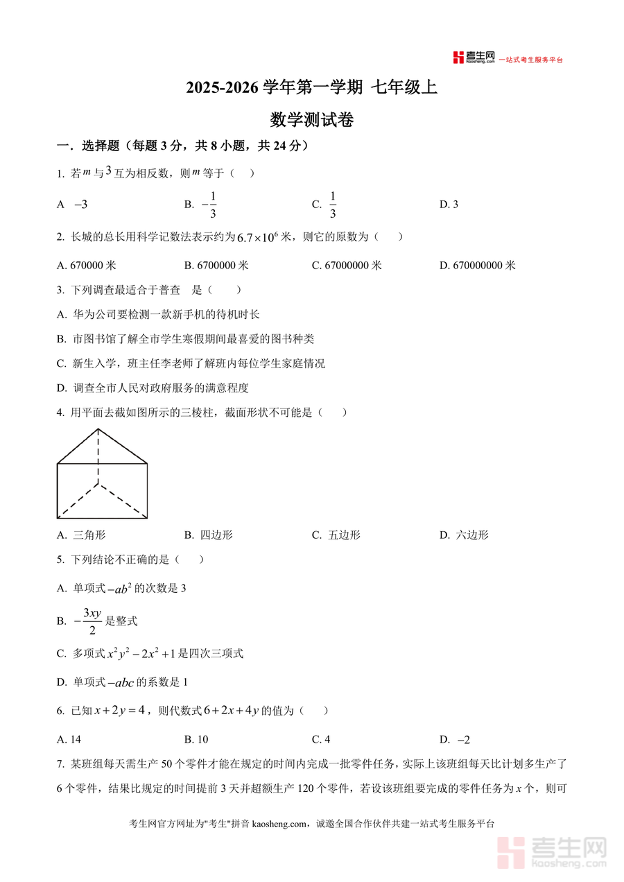 《精品解析:广东省深圳市福田区深圳实验学校初中部2025-2026学年七年级上学期1月月考数学试卷(原卷版).docx》是一份聚焦深圳实验学校初中部七年级数学教学重点与月考命题规律的优质备考资料。试卷结构完整,包含选择题(8小题)、填空题(5小题)及解答题(7小题)三大题型板块,覆盖相反数概念应用、科学记数法转化、普查与抽样调查选择、几何体截面形状判断、整式化简求值、一元一次方程实际应用、数轴绝对值分析、统计图表解读、几何体三视图绘制与表面积计算、线段比例求解、网约车收费问题及动轴分线创新题型等核心知识点。其特色在于严格匹配该校月考题型难度与考点分布,既注重基础概念考查又强化能力型题目设计,能有效反映学生知识掌握程度与综合应用能力。