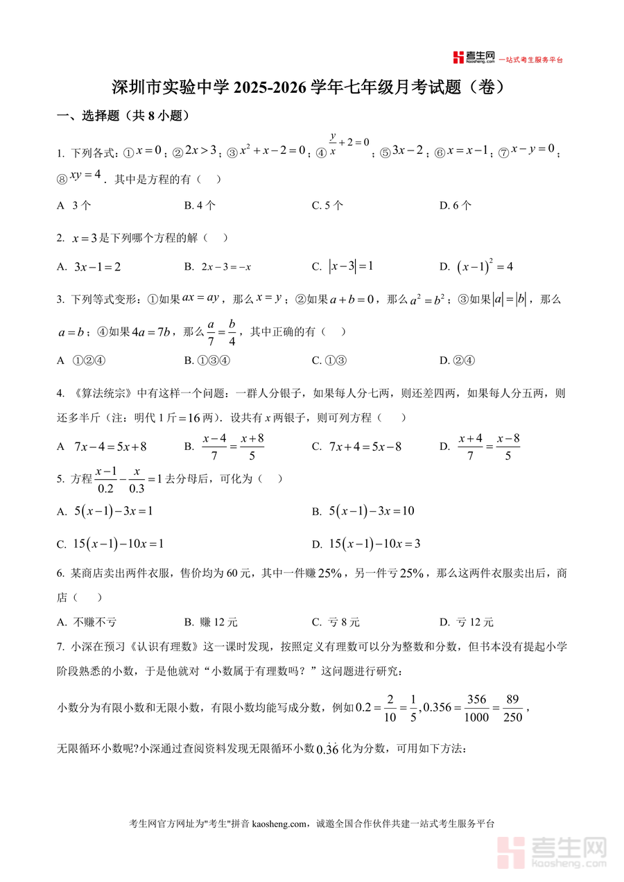本资料适用于深圳实验学校初中部七年级学生、备考该校月考的七年级学生、初中数学教师及关注孩子数学学习的家长。作为该校月考真题原卷,它是了解该校命题趋势与考试要求不可替代的资料,长期价值在于帮助学生构建系统的数学知识体系,提升逻辑思维与问题解决能力,为后续数学学习奠定坚实基础。