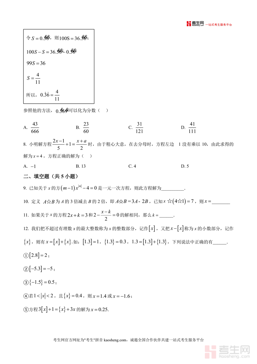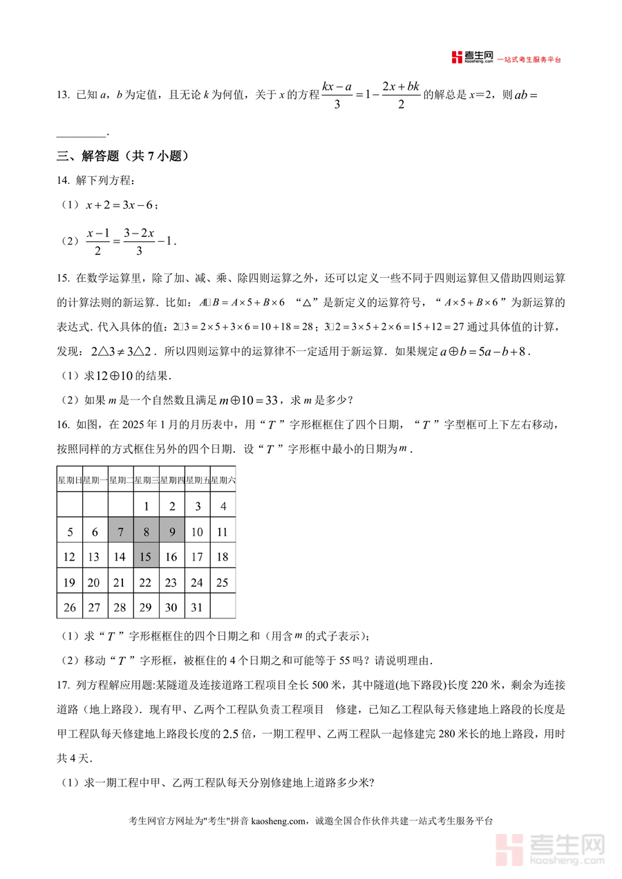 《精品解析:广东省深圳市福田区深圳实验学校初中部2025-2026学年上学期七年级月考数学试题(卷)(原卷版).docx》是一份针对深圳实验学校初中部七年级上学期数学阶段性检测的真题原卷资料,核心定位为精准反映该校教学进度与命题风格的备考资料。文件包含选择题(8小题)、填空题(5小题)及解答题(7小题)三大题型,覆盖有理数分类、一元一次方程求解与应用、新定义运算、数轴动点问题等七年级上册数学核心知识点;特色亮点在于完整保留原卷结构与题型设置,题目情境贴合学生生活实际与学科拓展需求,能真实还原该校月考的考试场景与难度梯度。