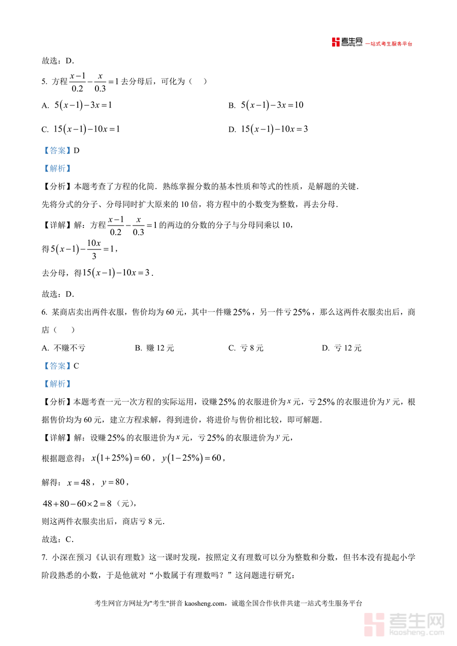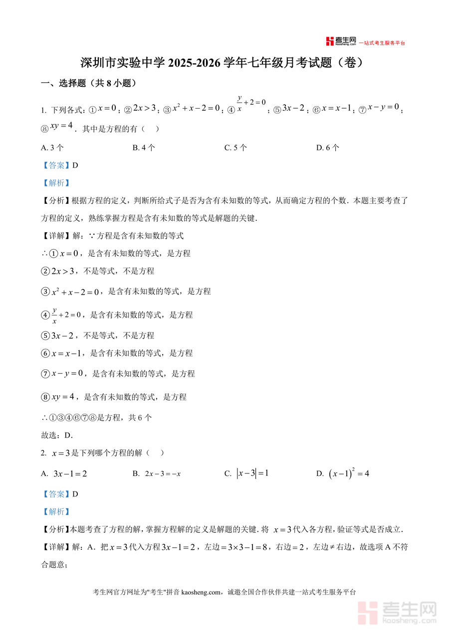 本资料适用于深圳实验学校初中部及周边同类学校七年级数学教师(备课参考题型设计)、七年级学生(月考备考与核心知识巩固)、家长(辅助孩子进行错题订正与复习规划)。作为精准对接深圳实验学校月考要求稀缺备考资料,其不可替代性在于真题资源独家且解析深度适配学生认知水平;长期价值在于可作为七年级数学核心知识点(如一元一次方程)系统复习与能力提升优质参考素材,助力学生夯实基础,提升应试能力与数学思维。