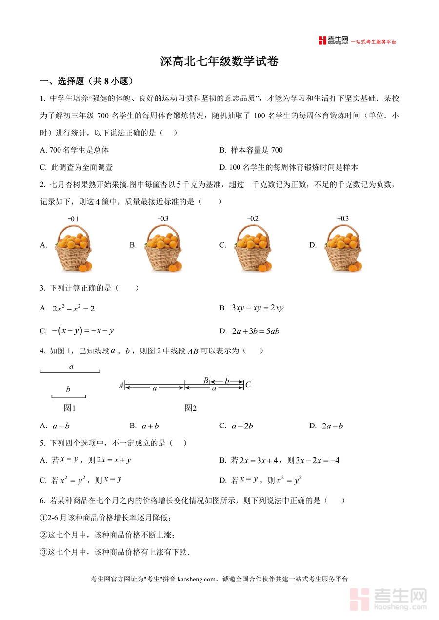 适用人群为广东省深圳市高级中学北校七年级在读学生、深圳地区七年级数学学习者及需要针对性备考同类月考题型的学生。该文件作为该校月考原卷版资料,其必要性体现在能直接反映该校教学重点与考试方向,不可替代性在于其真实性与地域性适配性;长期价值则在于帮助学生积累典型题型解题经验,培养数学思维能力,为后续初中数学学习奠定坚实基础,是提升数学学科素养与应试能力的重要备考资料。