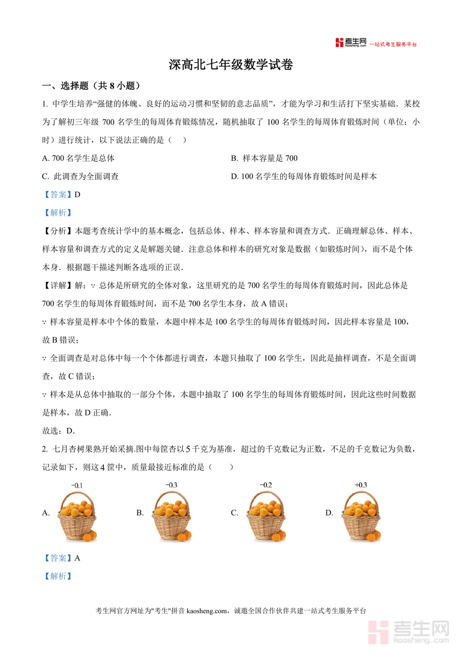 《精品解析:广东省深圳市高级中学北校2025-2026学年上学期七年级数学第二次月考试卷(解析版).docx》是一份针对深圳高级中学北校七年级数学第二次月考真题设计专业备考资料,包含选择题(8道)、填空题(5道)及解答题(8道)三大题型,覆盖统计学基本概念、正负数实际应用、整式加减运算等核心考点;其特色亮点在于每道题均配有深度解析,不仅明确考点定位,还剖析解题思路与易错点(如第1题强调总体研究对象为"锻炼时间"而非"学生本身"),帮助使用者精准把握知识内核。
