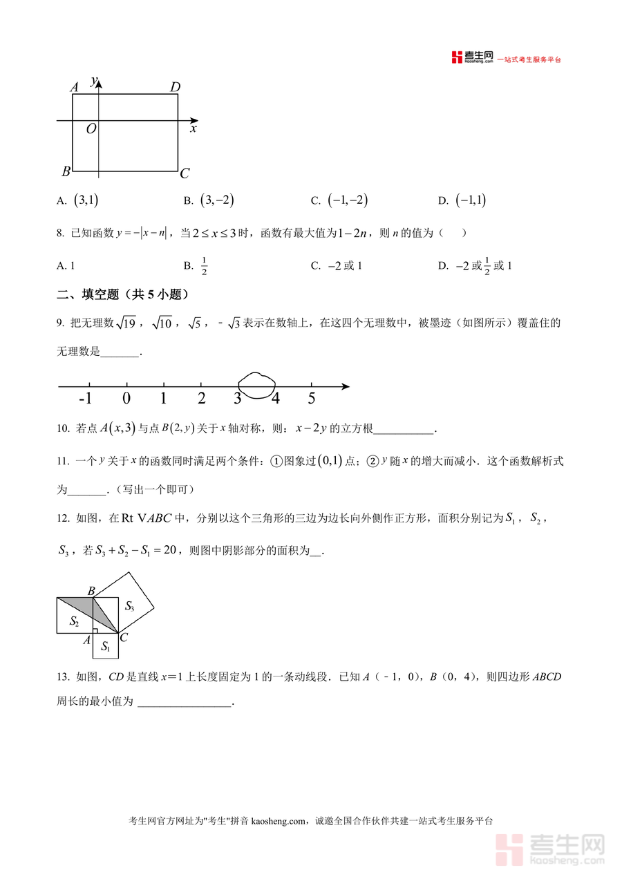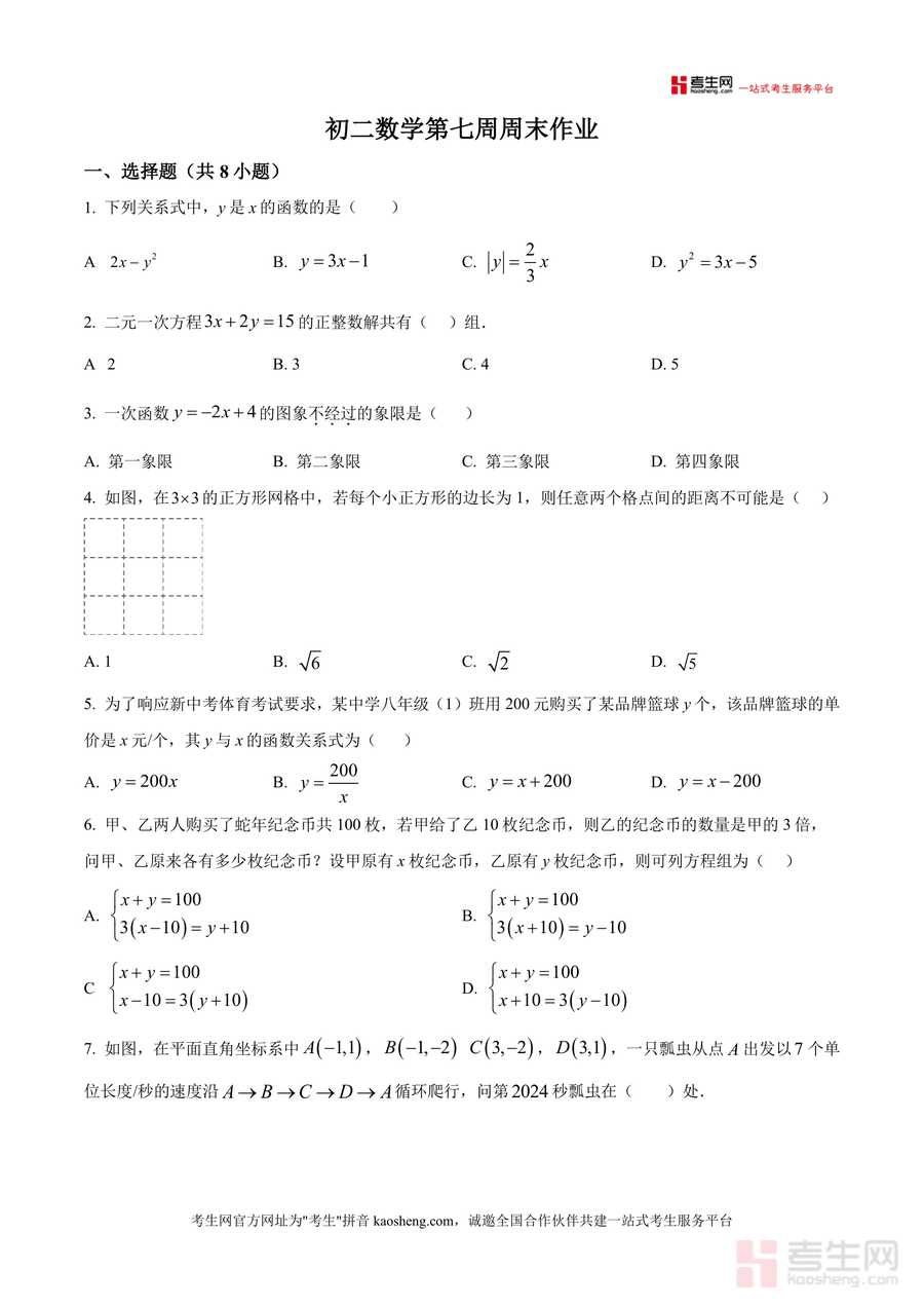 《精品解析:广东省深圳市龙华区深圳外国语学校龙华学校2025-2026学年七年级上学期第七周周测数学试卷(原卷版).docx》是一份贴合深圳外国语学校龙华学校七年级数学教学进度与学情特点的周测真题资料,涵盖选择题、填空题、解答题三大题型共20道题目。内容聚焦七年级上册核心知识点,包括一次函数与反比例函数概念及应用、二元一次方程组的建立与求解、勾股定理及其几何应用、坐标平面内图形变换与动点问题等,同时融入新中考命题趋势下的创新题型如结合函数图象的实际应用问题、“数形结合”模型建立类探究题等特色内容。