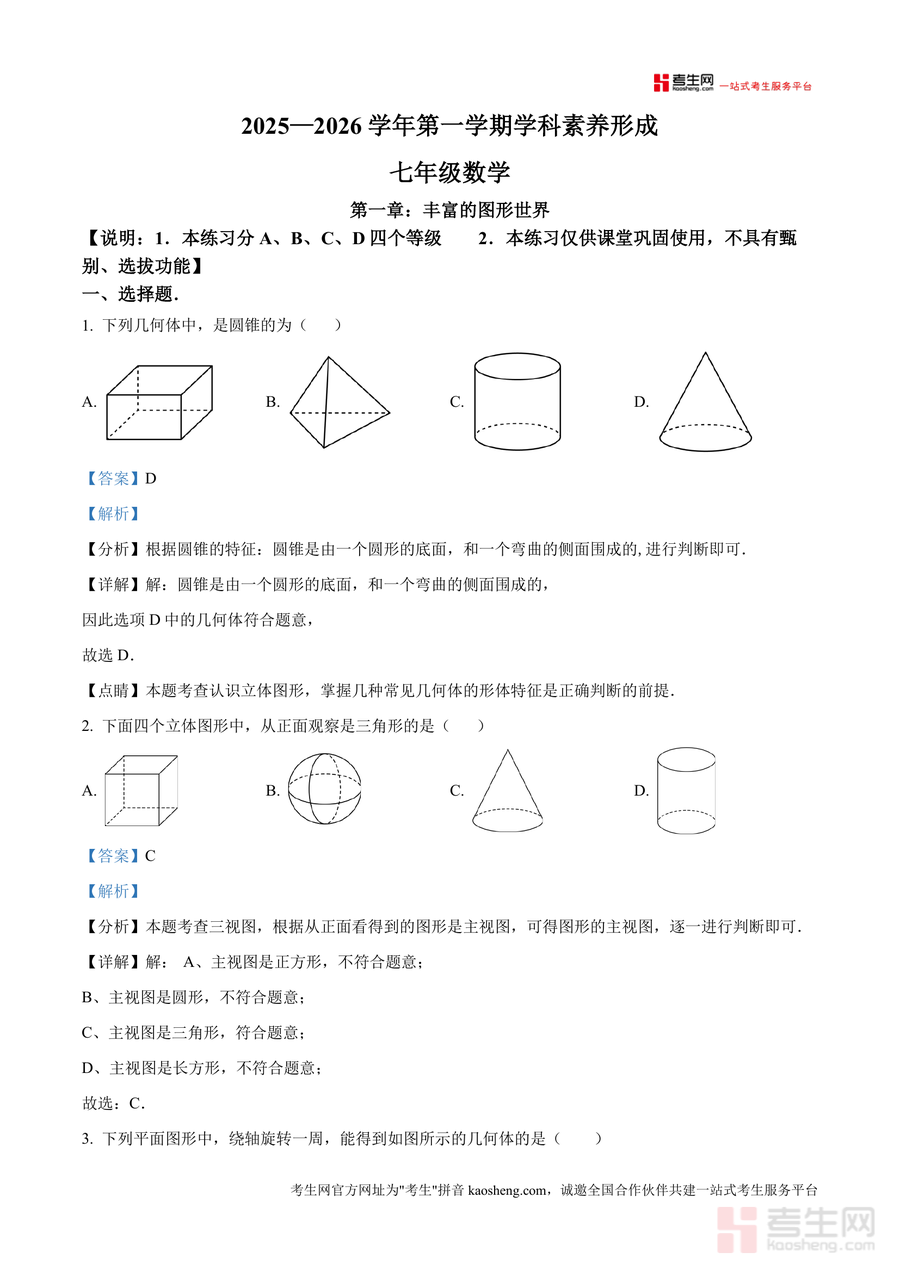 《精品解析:广东省深圳市龙华区行知学校2025—2026学年七年级上学期数学第一次月考试卷(解析版).docx》是一份针对该学校七年级上学期数学第一次月考设计制作,聚焦第一章“丰富图形世界”核心考点的专业备考资料。资料包含8道选择题(如立体图形识别)、5道填空题(如点线面体关系)及4道解答题(如几何体侧面积计算),覆盖三视图、展开图等关键知识点;特色亮点在于每道题目均配备精准考点分析(如圆锥特征判断依据)、规范解答步骤及易错点总结,同时结合学科素养形成要求,适配课堂巩固与能力提升双重需求。