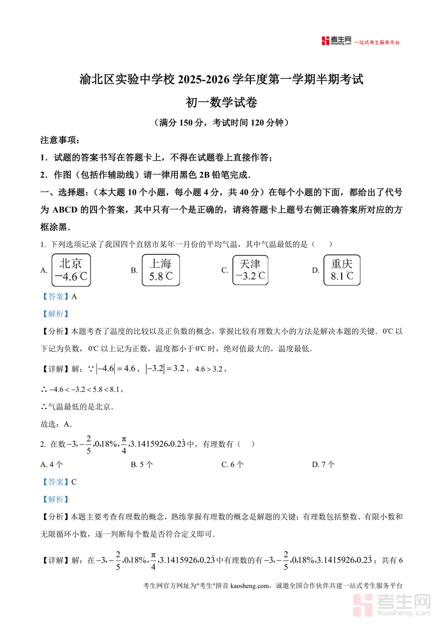 本资料适用于重庆市渝北实验中学及周边区域七年级学生、初中数学教师及备考家长。作为贴合本地学情 的真题解析资料,它不仅能帮助学生熟悉考试题型与难度,更能培养其逻辑思维与解题能力,具有不可替代 的备考价值;长期使用可助力学生构建扎实 的数学知识体系,为后续代数、几何等模块学习奠定坚实基础,是七年级数学中期备考 的必备工具。