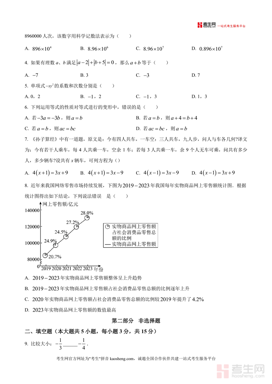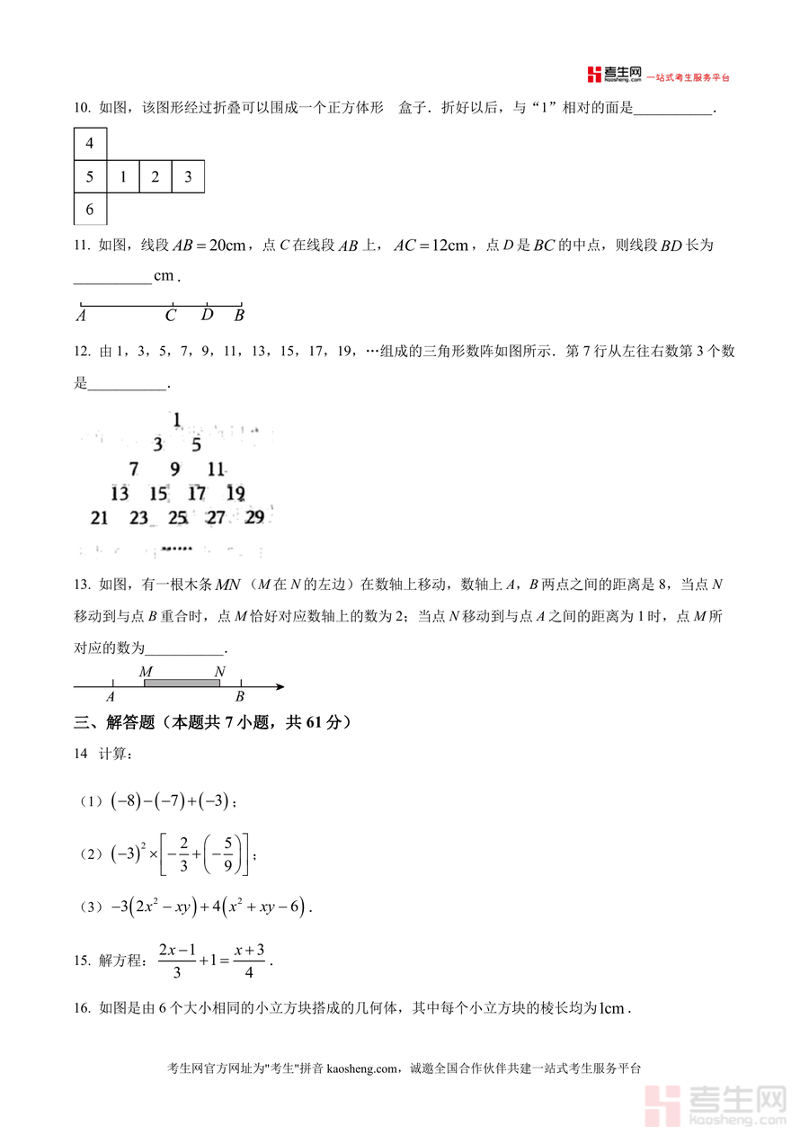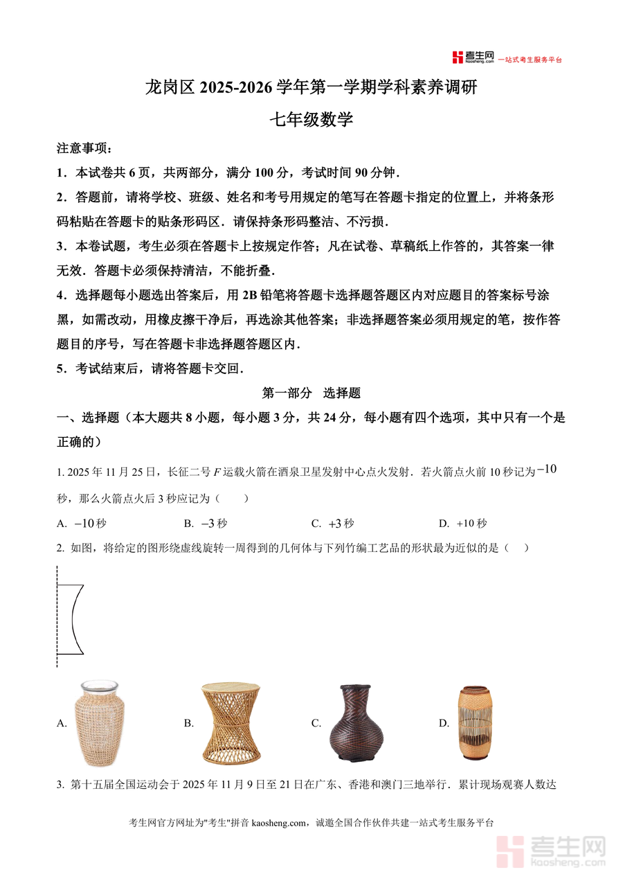 《精品解析:广东省深圳市龙岗区2025-2026学年上学期七年级数学调研试题(原卷版).docx》是一份聚焦龙岗区七年级数学学科素养调研的官方原卷资料。该文件包含选择题(8小题)、填空题(5小题)、解答题(7小题)三大题型共20道题目,覆盖有理数表示与运算、代数式概念与应用、一元一次方程求解与实际应用、几何图形展开与折叠等七年级上册核心知识点。其特色亮点在于融入长征火箭发射时间记录、全运会观赛人数科学记数法等时事素材及《孙子算经》经典乘车问题、数轴木条移动等实践性题目,既贴合教材内容又联系生活实际,有效考查学生知识迁移能力与学科素养。