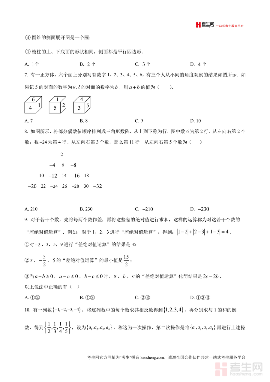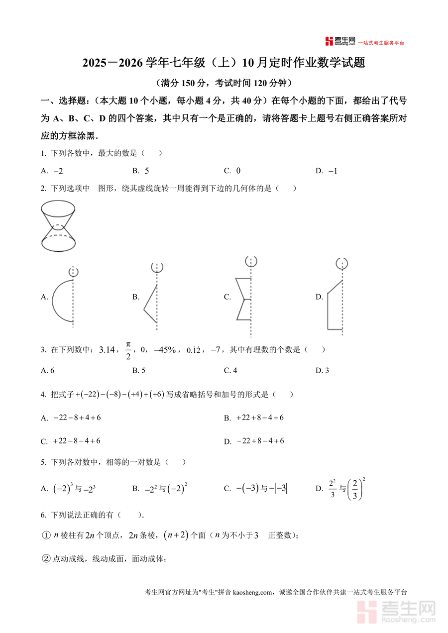 《精品解析:重庆市第110中教育集团2025-2026学年上学期七年级第一学月定时作业数学试题(原卷版)》是一份针对七年级上册数学第一学月教学成果设计的标准化检测试题资料。主要内容包含10道选择题(40分)、8道填空题(32分)、7道解答题(78分),覆盖有理数运算、几何图形认识与变换、数轴应用等七年级上册前两章核心知识点。特色亮点在于严格遵循本地教学进度与考纲要求,题目设置兼顾基础巩固与能力拓展,如选择题中的"差绝对值运算"、解答题中的数轴动点问题等,能有效检验学生对核心概念的理解深度与综合应用能力。