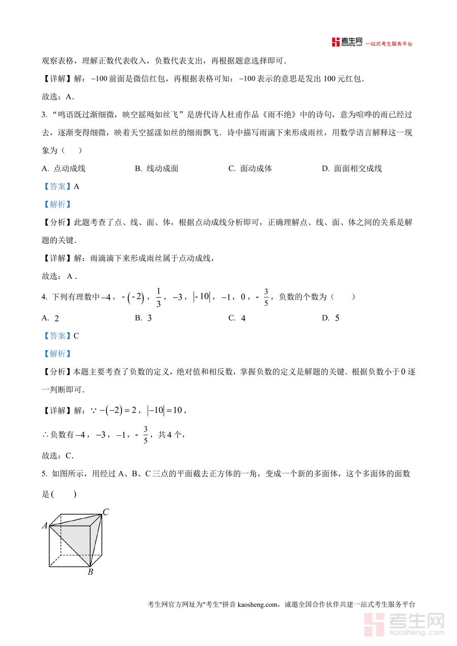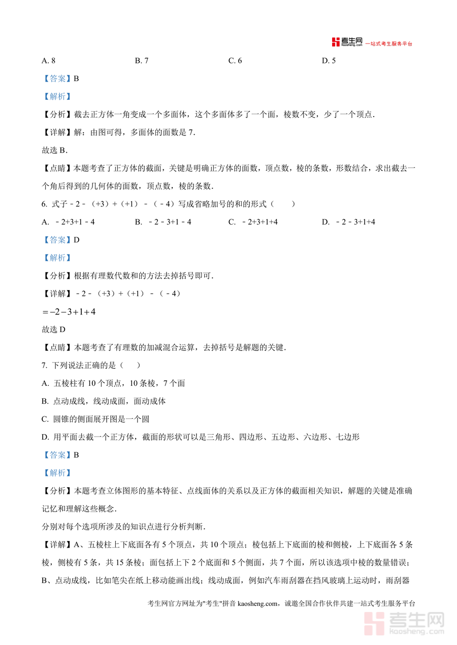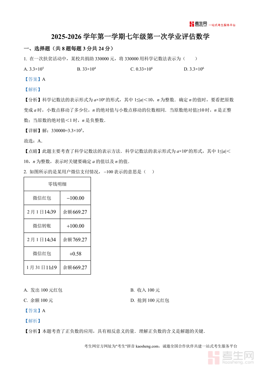 《精品解析:广东省深圳市龙岗区华附集团同心实验学校2025-2026学年七年级上学期第一次月考数学(解析版)docx》是一份针对该校七年级上册首次月考数学真题的专业备考资料及深度解析文档。其核心内容覆盖选择题(8题24分)、填空题(5题15分)、解答题(7题61分)三大题型模块,每道题目均包含考点分析、详细解答步骤及解题点睛部分,涉及科学记数法正负数应用、点线面体关系有理数运算等七年级上册数学核心知识点。特色亮点在于严格贴合该校考情解析过程注重方法提炼与思维引导帮助学生理解考点本质而非单纯记忆答案。