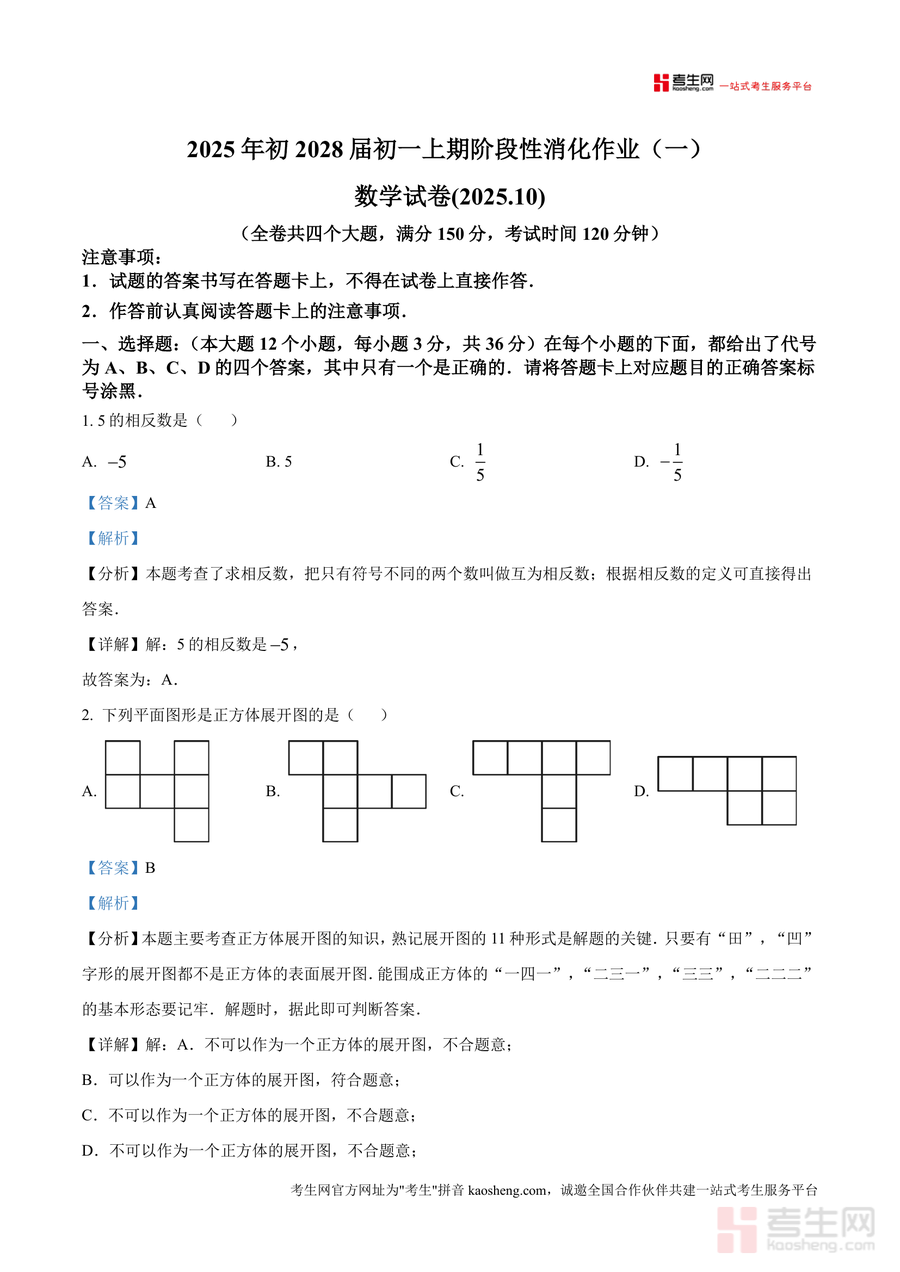 《精品解析:重庆市第一中学校2025-2026学年七年级上学期数学月考试卷(解析版).docx》是一份针对初一学生数学月考备考与知识巩固的数据类资料,涵盖七年级上学期核心知识点(如有理数运算、整式基础、几何图形初步等)。文件包含全卷四大题(选择、填空等)共150分完整试题及详细解析,每个题目均配备"分析"与"详解"模块——如选择题中对相反数定义精准阐释,填空题里科学记数法与绝对值非负性考点剖析,既呈现解题步骤又点明考点本质。特色在于贴合重庆一中阶段性教学进度,以"消化作业"形式巩固近期所学,解析注重方法迁移,助力学生掌握同类题型解题逻辑。