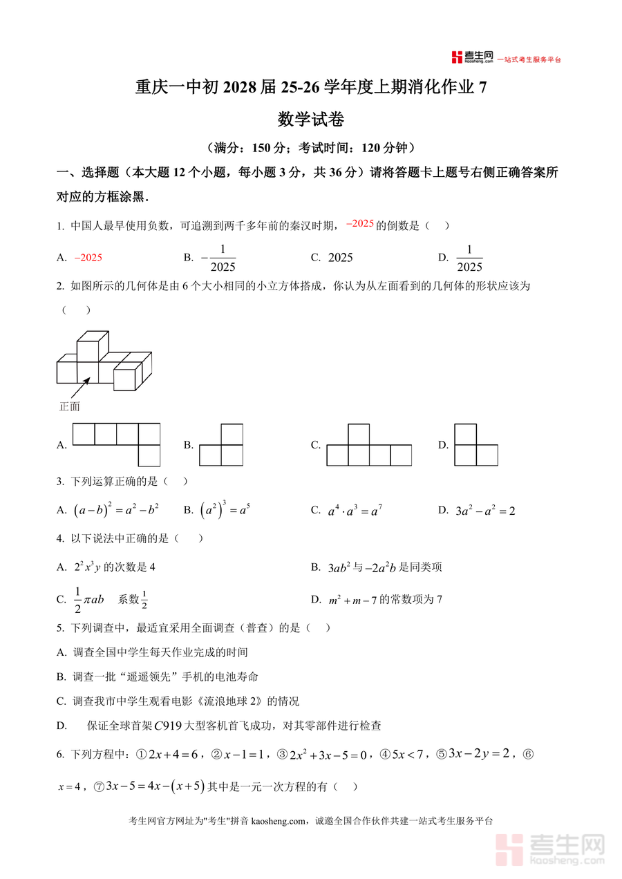 《精品解析:重庆市第一中学校2025-2026学年上学期七年级消化作业数学试卷(1月3号)(原卷版)》是一份针对重庆一中初2028届七年级学生设计的阶段性数学巩固备考资料。该试卷涵盖选择题、填空题、解答题三大题型共30道题目(12道选择、8道填空、10道解答),考查内容覆盖有理数运算、几何图形识别与计算、一元一次方程应用、统计与概率初步等七年级上册核心知识点。试卷特色在于贴合学校教学进度与命题风格,题目设计梯度分明,既有基础概念题(如第1题倒数计算、第4题同类项判断),也有中档能力题(如第7题实际应用列方程、第9题代数式求值),更包含思维拓展题(如第8题棋子规律探究、第19题正方形阴影周长差计算),全面检测学生知识掌握程度。