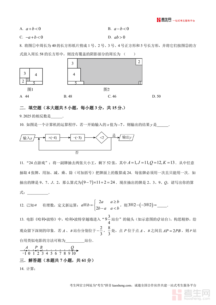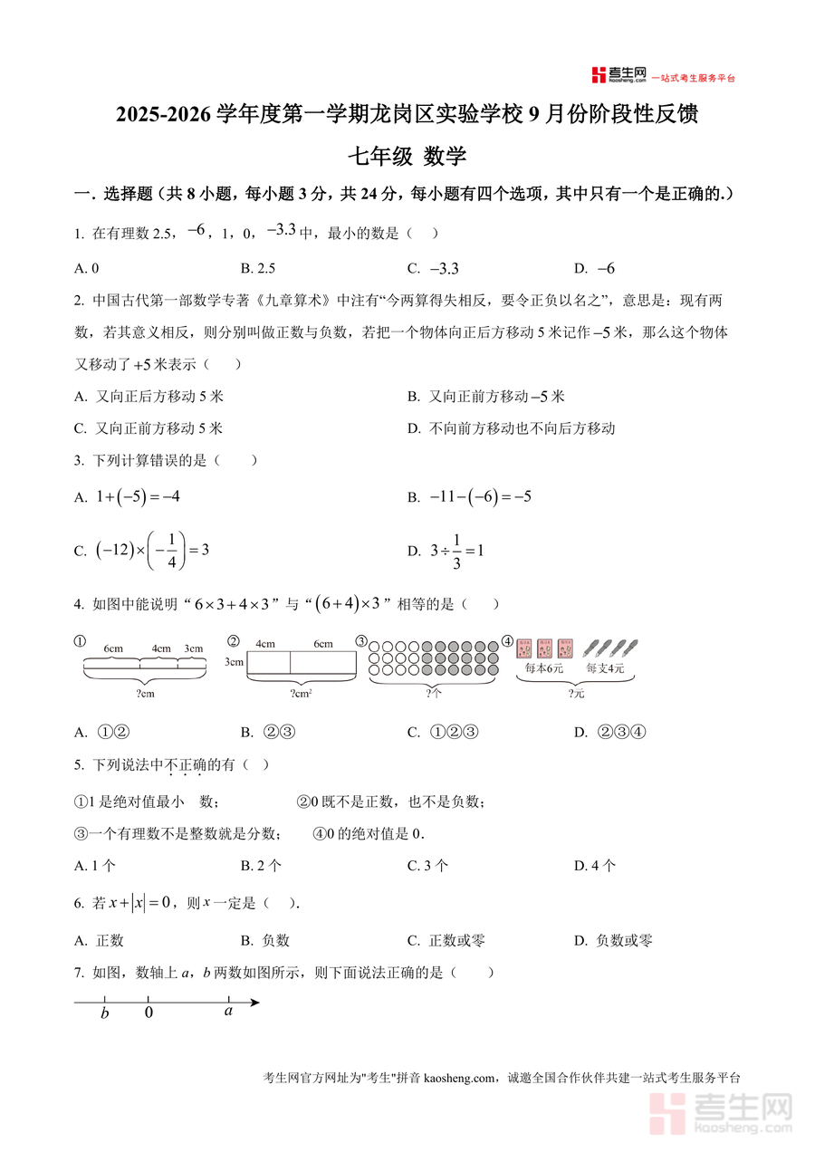 《精品解析:广东省深圳市龙岗区实验学校2025-2026学年七年级上学期9月份阶段性反馈数学试卷(原卷版).docx》是一份针对七年级数学开学初期学习成果检测的高质量备考资料。该资料包含8道选择题、5道填空题及7道解答题三大题型板块,覆盖有理数概念与运算、绝对值几何意义、数轴动点问题、新定义运算等核心知识点完整还原龙岗区实验学校9月阶段性反馈考试命题结构与难度梯度其特色亮点在于以原卷形式呈现真实考试场景题目设计贴合深圳本地教学大纲要求既注重基础知识点巩固又融入对数学思维能力考查为学生提供精准匹配校考节奏练习载体