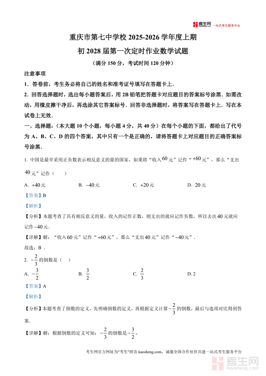 《精品解析:重庆市第七中学校2025-2026学年七年级上学期第一次定时作业数学试题(解析版).docx》是一份针对重庆七中初2028届首次定时作业打造真题解析类备考资料,涵盖选择题、填空题及解答题全题型内容,每道题均配备考点标注(如正负数意义、倒数定义)、解题思路拆解及规范解答步骤。其特色亮点在于深度结合校考命题方向,对基础概念(如数轴三要素)与思想方法(如数形结合)进行精准剖析,同时针对易错点(如负有理数判断、绝对值化简)给出明确提示,帮助学生快速把握知识核心。