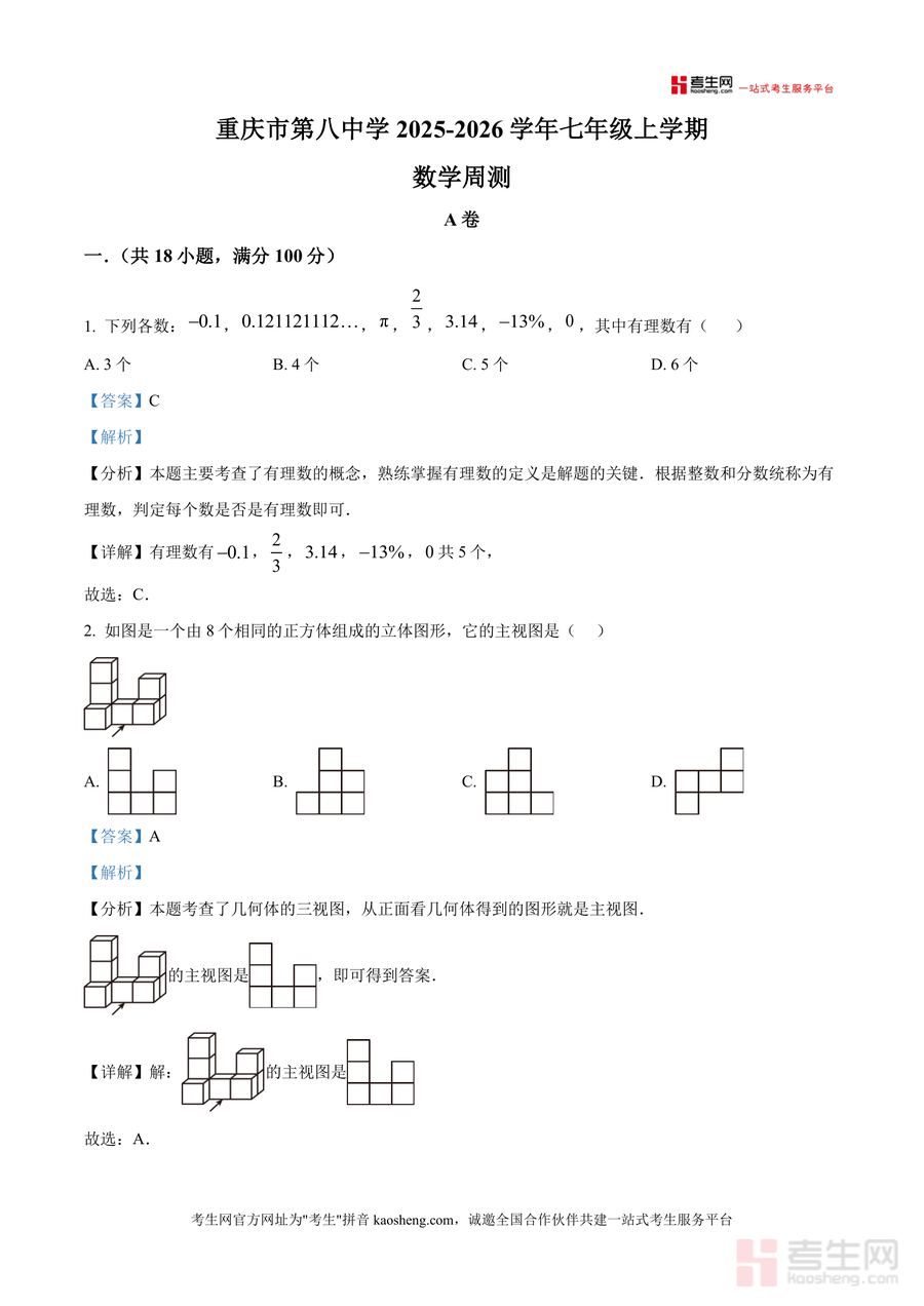 《精品解析:重庆市第八中学校2025-2026学年七年级上学期数学周测(解析版).docx》是一份针对重庆八中七年级上学期数学周测真题及详细解析编写的高质量备考资料。文件包含A卷18道基础题型与B卷8道拓展题型,覆盖有理数概念、立体图形三视图、同类项判定、几何位置关系、一元一次方程等核心知识点,每道题均配备考点分析、步骤拆解及易错点提示,解析逻辑清晰且贴合教材课标要求,能帮助学生快速掌握解题思路与方法,是兼具实用性与指导性 的真题解析资料。